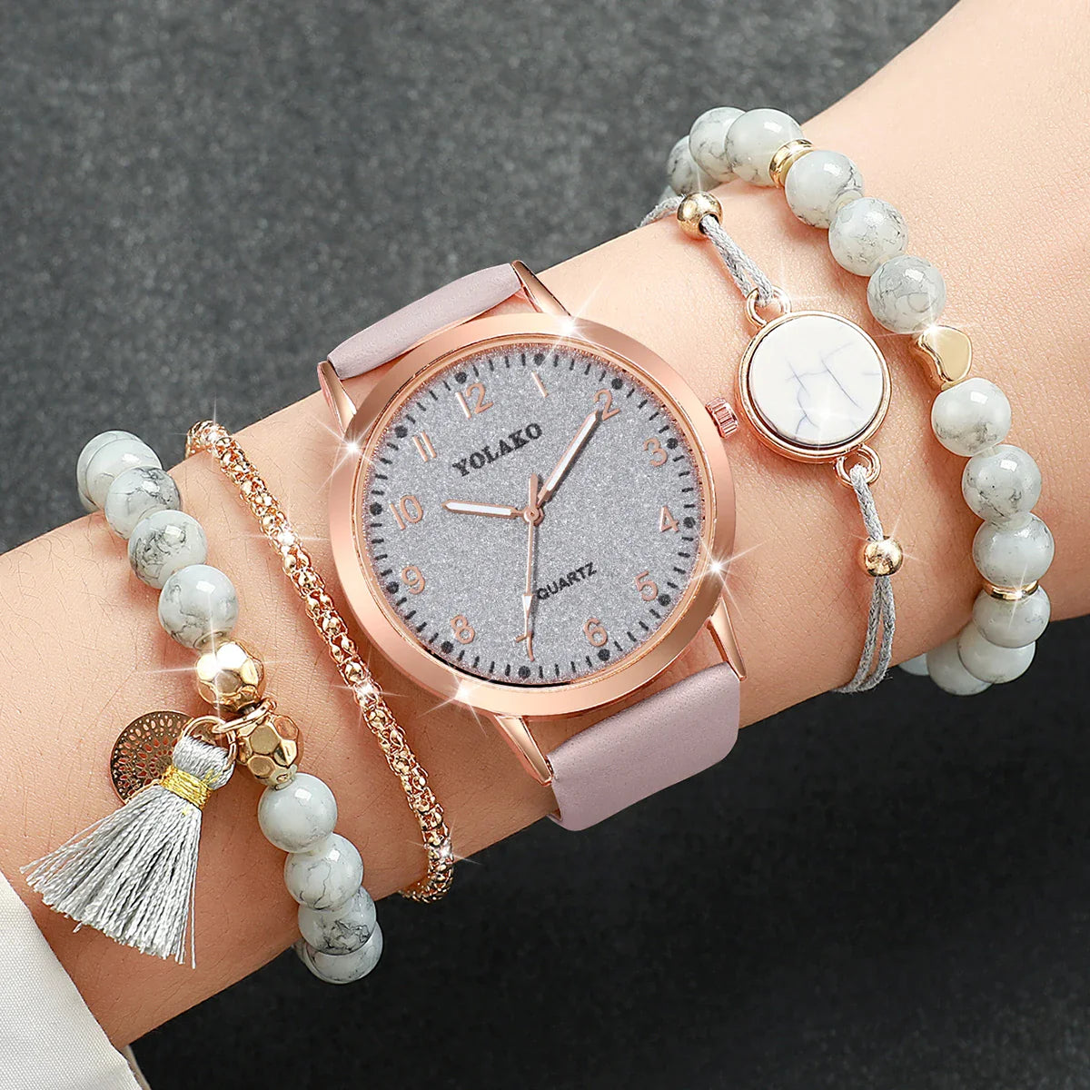 5PCS/Set Fashion Arabic Dial Women Quartz Watch Casual Leather Band Wrist Watches Bracelets Set(Without Box)
