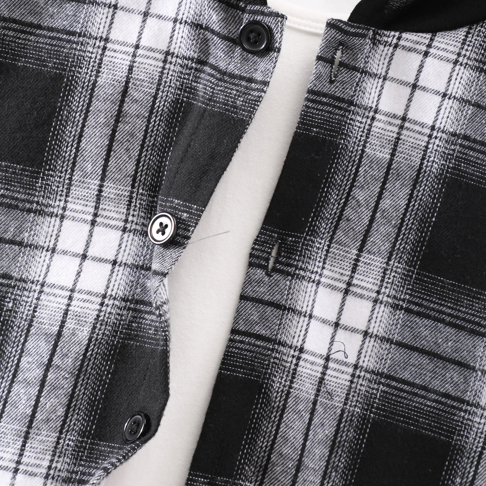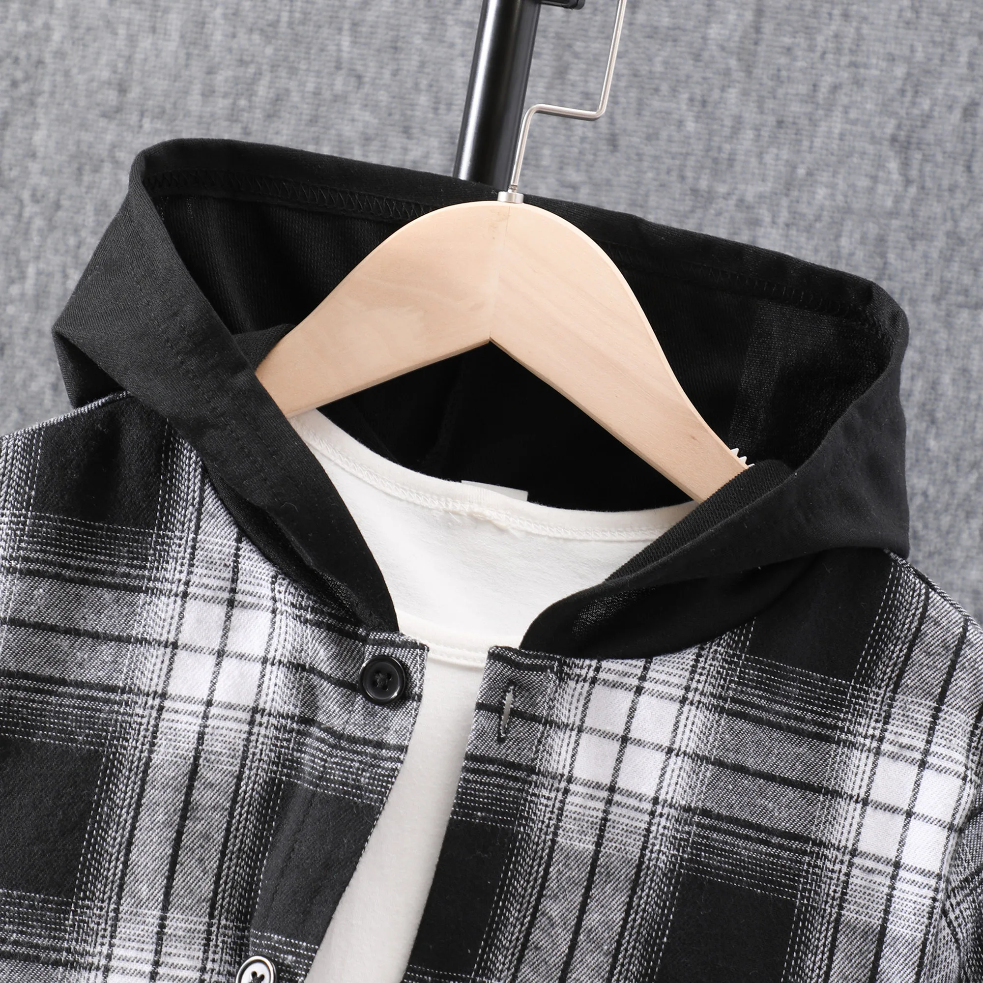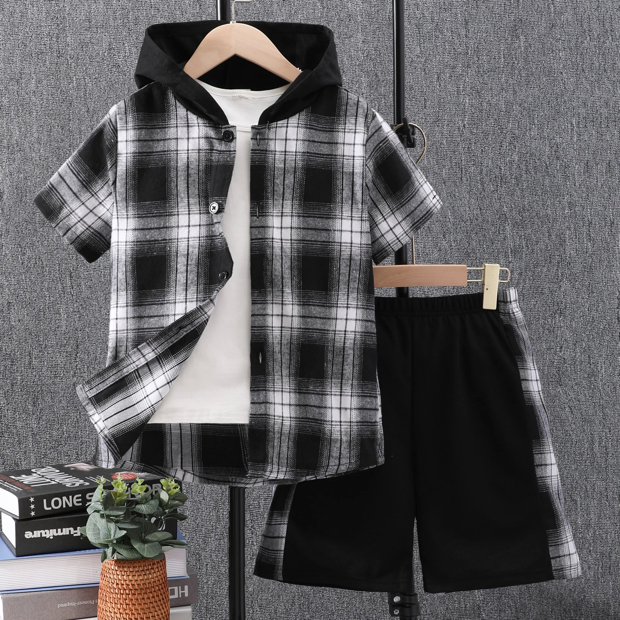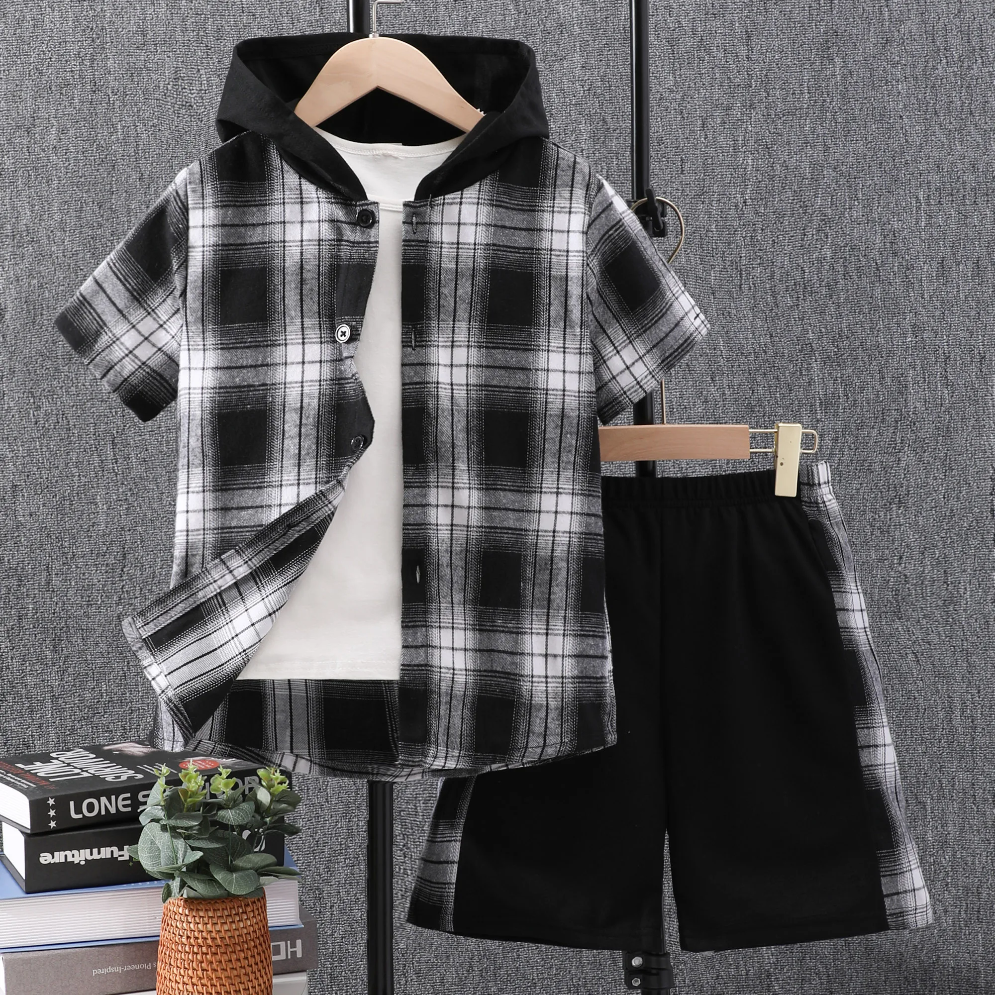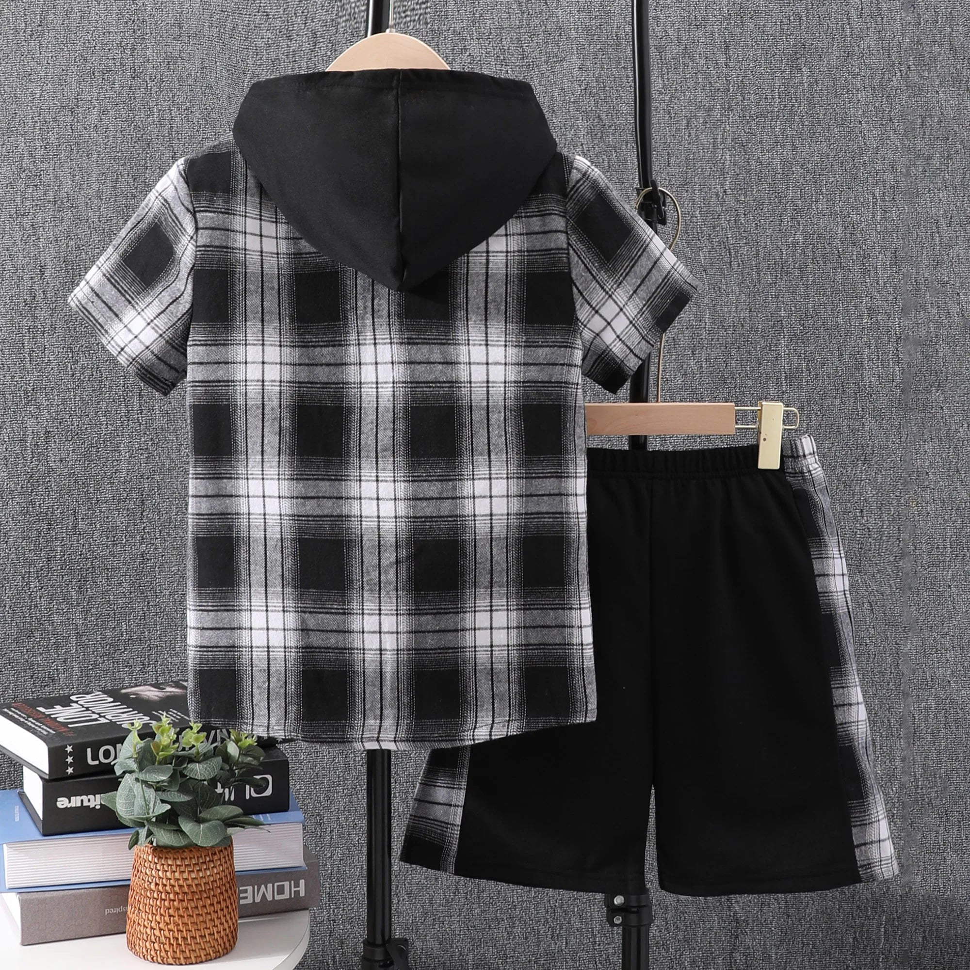 This boys' outfit features a stylish plaid design, perfect for the summer season. The short sleeves and hooded shirt add a casual yet trendy touch.