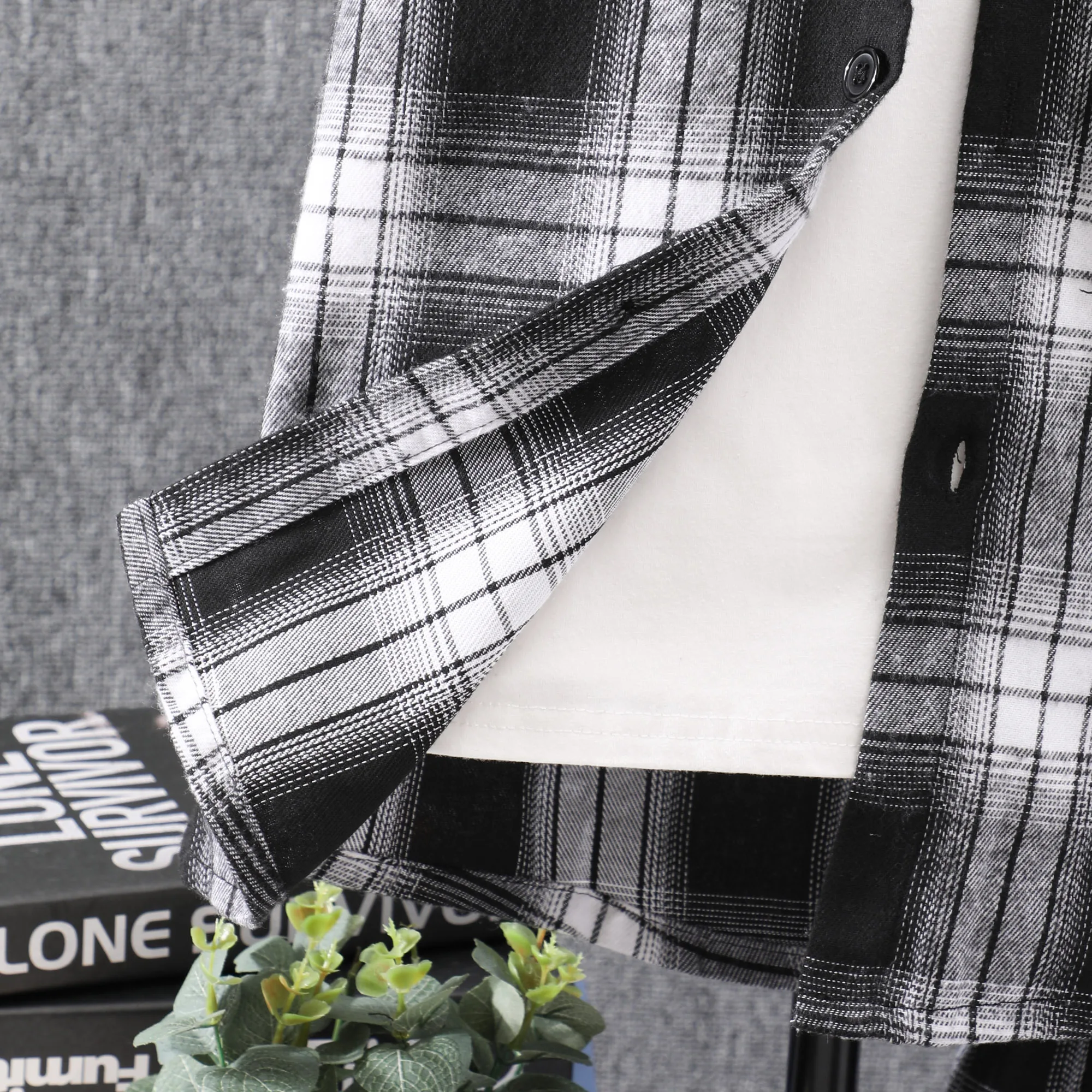 The outfit features a trendy plaid design, perfect for the stylish boy. It's a timeless pattern that never goes out of style, making it a great addition to his wardrobe.