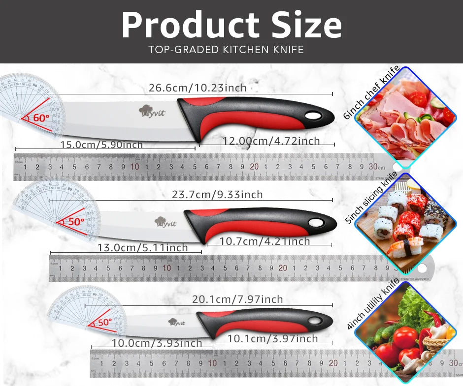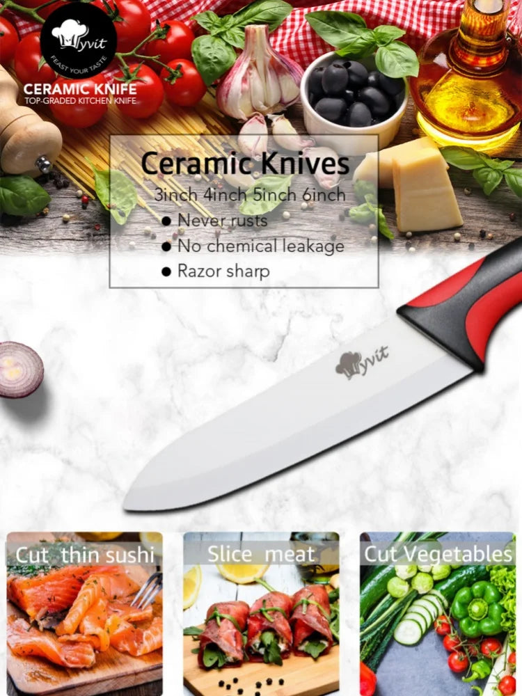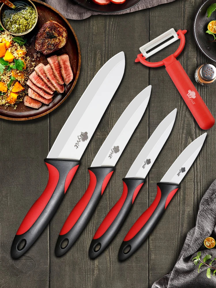Transform your culinary adventures with the Ceramic Knives Kitchen Set, featuring essential knives in 3, 4, 5, and 6 inches and a handy peeler. This chef knife set is designed to meet all your slicing, dicing, and peeling needs, making it an indispensable addition to your kitchen arsenal. Whether you're a home cook or a professional chef, these knives deliver precision and performance that rival popular brands like Victorinox knives, Henkel knives, and Cut Co knives.