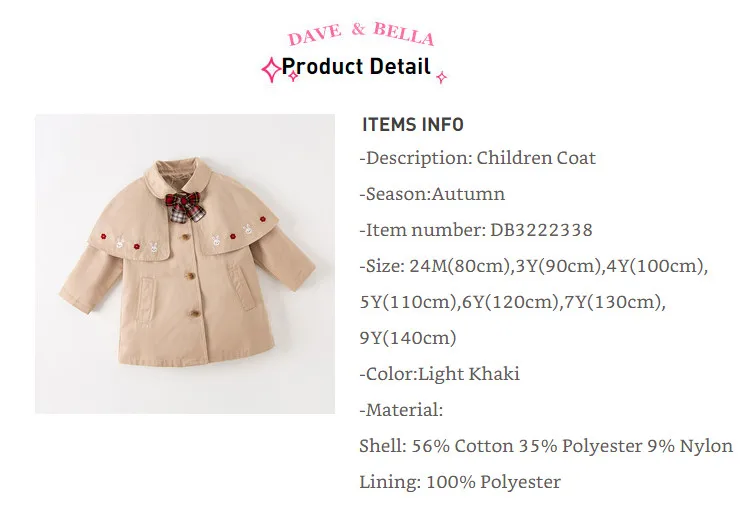 Crafted from high-quality materials, this coat ensures your child stays cozy during chilly spring mornings and cool autumn evenings. The classic khaki color complements any outfit, making it easy to mix and match with her favorite pieces. The design also features a durable yet soft fabric that’s gentle on your child's skin, perfect for daily wear.