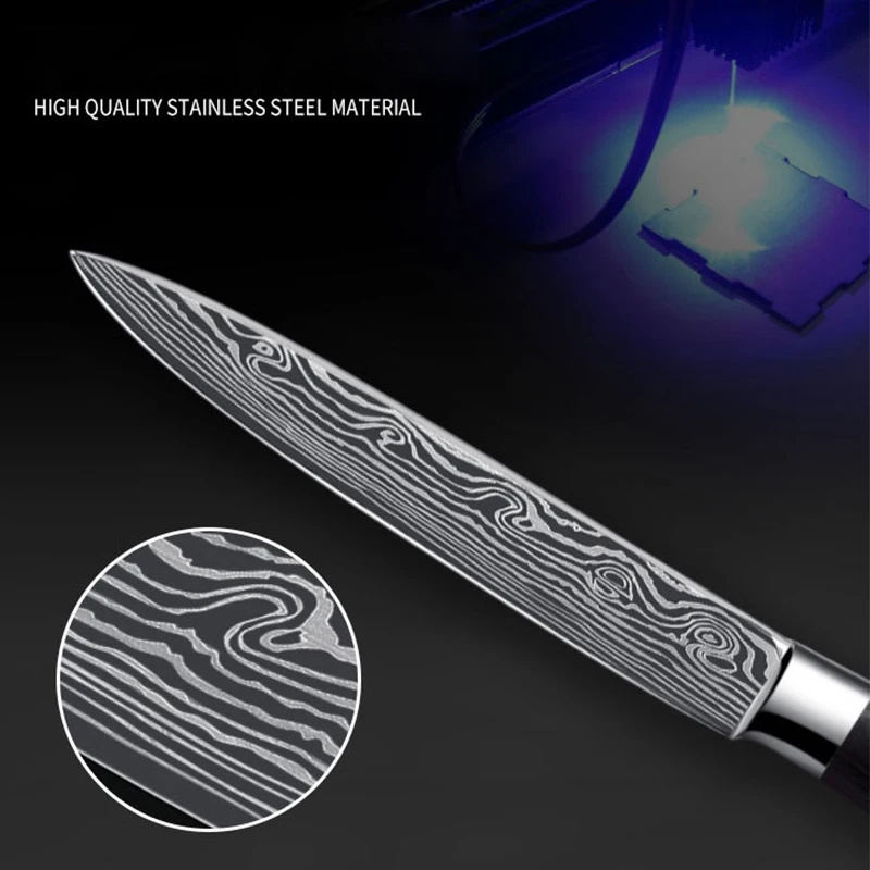 Introducing our Kitchen Utility Knife, a Stainless Steel masterpiece designed to handle all your culinary needs. With its Damascus laser pattern and versatile functionality, this knife is perfect for slicing meat, dicing fruits, and chopping vegetables, making it a must-have addition to your set of cutlery. Whether you’re an experienced chef or a passionate home cook, this knife will elevate your kitchen experience.