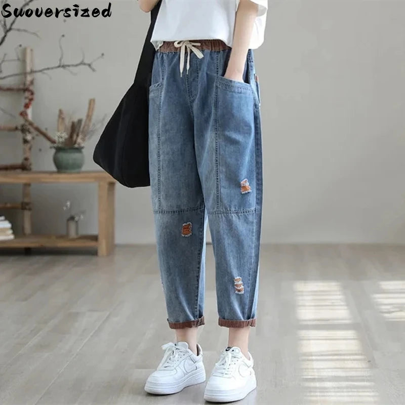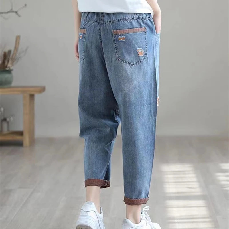 Ripped Splice Baggy Ankle-Length Harem Jeans – Women’s Elastic High Waist Denim Pants
