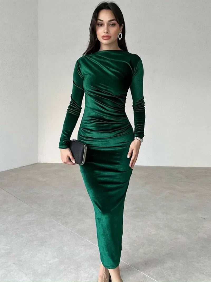 Introducing our sophisticated Formal Attire Dresses: Women O-neck Folds High Waist Mid-calf Velvet Dress, designed to elevate your elegance for any occasion. This dress combines timeless charm with modern allure, making it a perfect addition to your wardrobe.