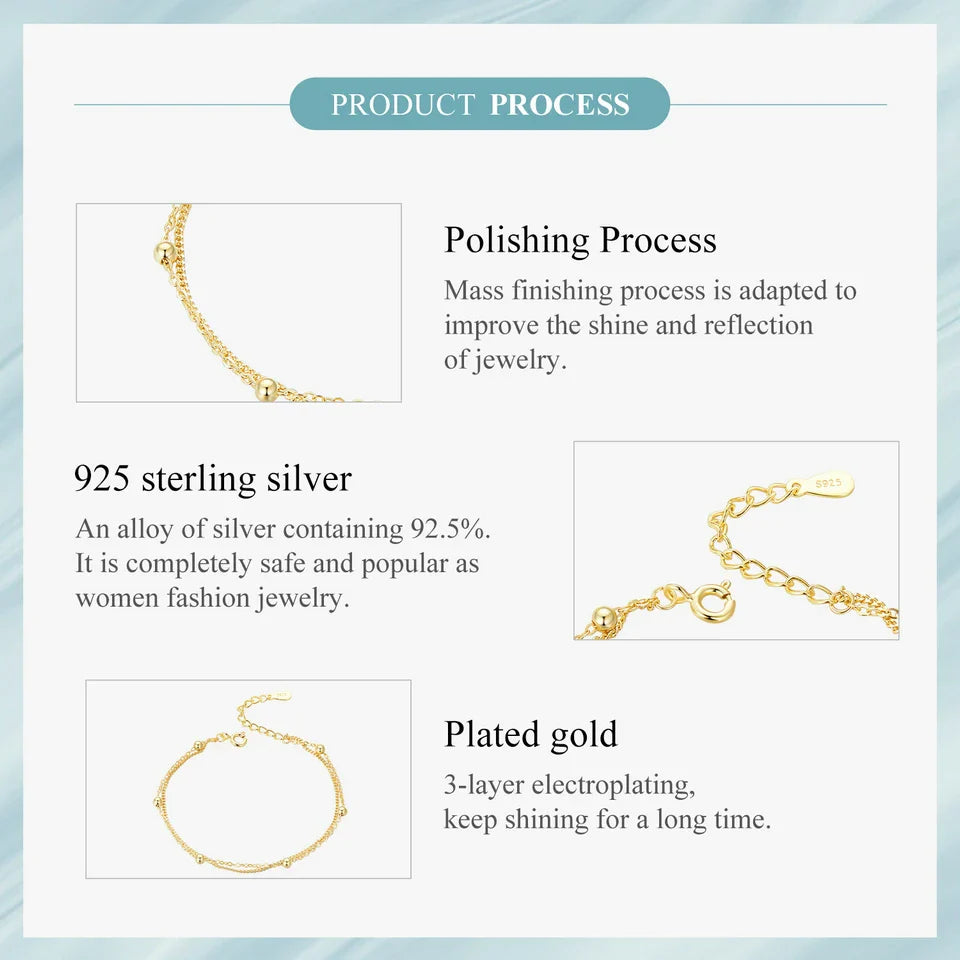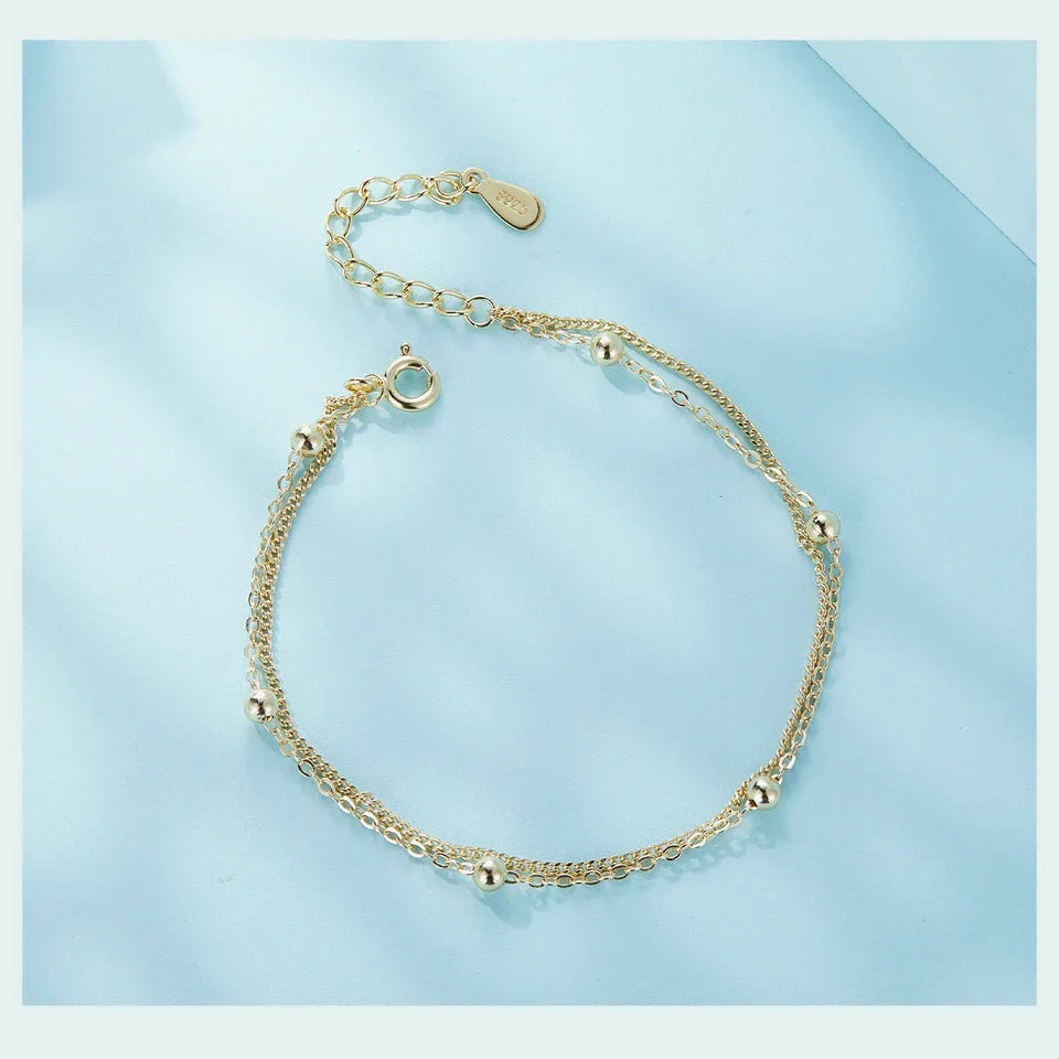 BAMOER 925 Silver Chain Bracelet Double Layers Round Beads Link Chain Bracelets Women 7.48'' Adjustable 14K Gold Plated Jewelry