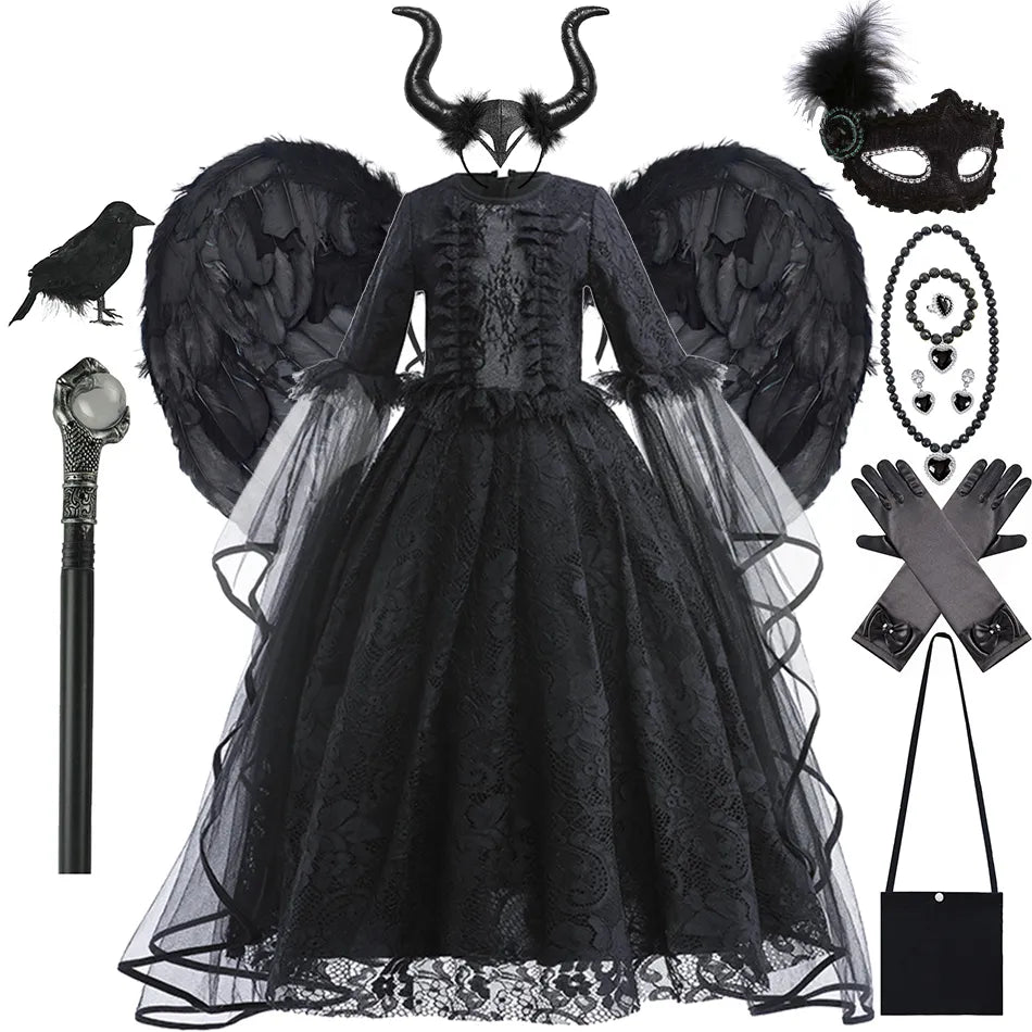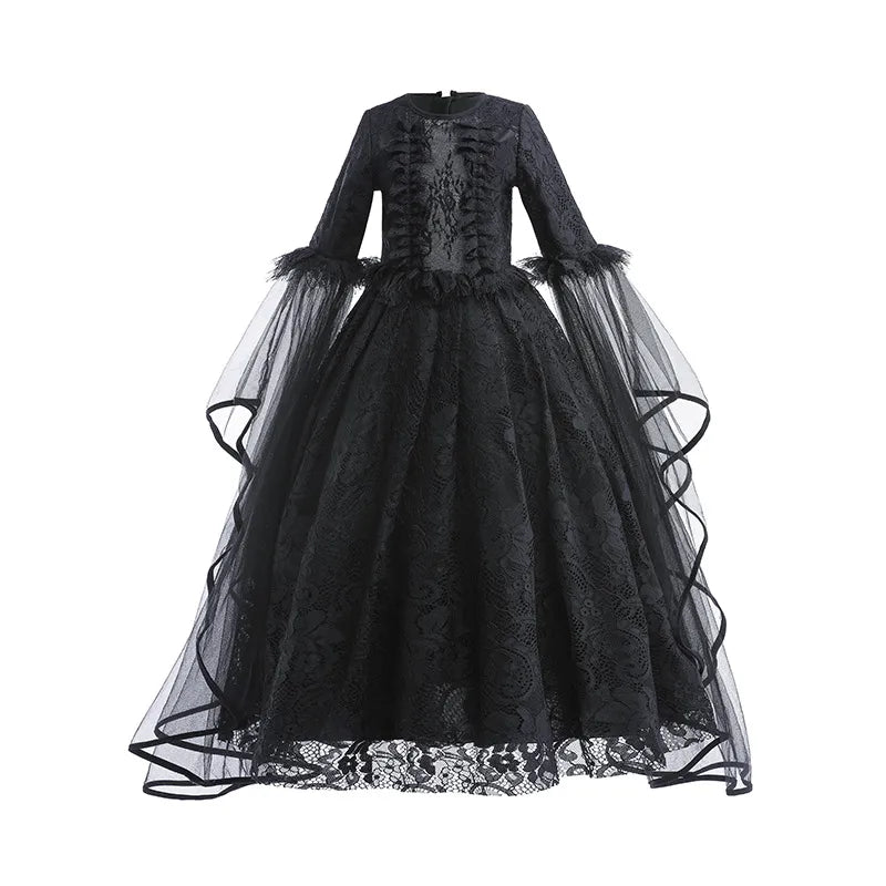Transform your little one into a spellbinding sorceress with our Halloween Witch Dress for Girls. This luxurious black dress, adorned with lace ruffles, is perfect for an Evil Queen cosplay costume. Designed for comfort and dramatic flair, it’s the ideal choice for Halloween parties and cosplay events.