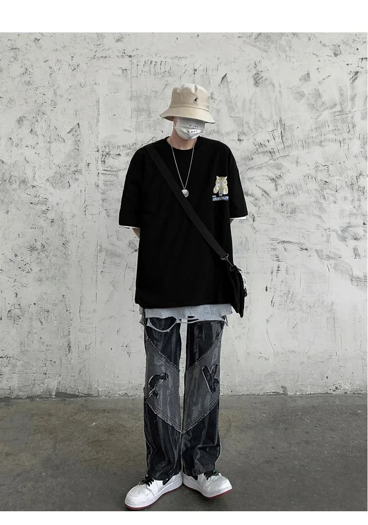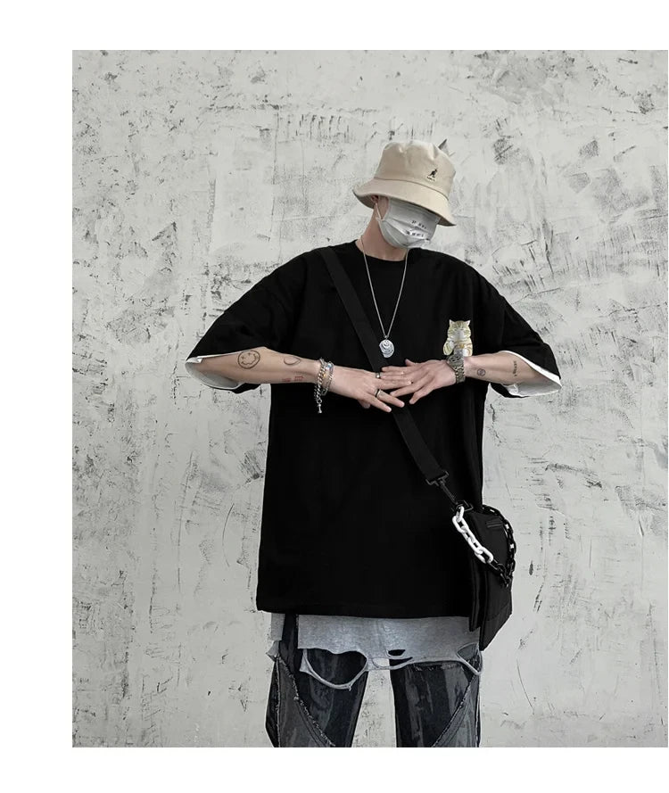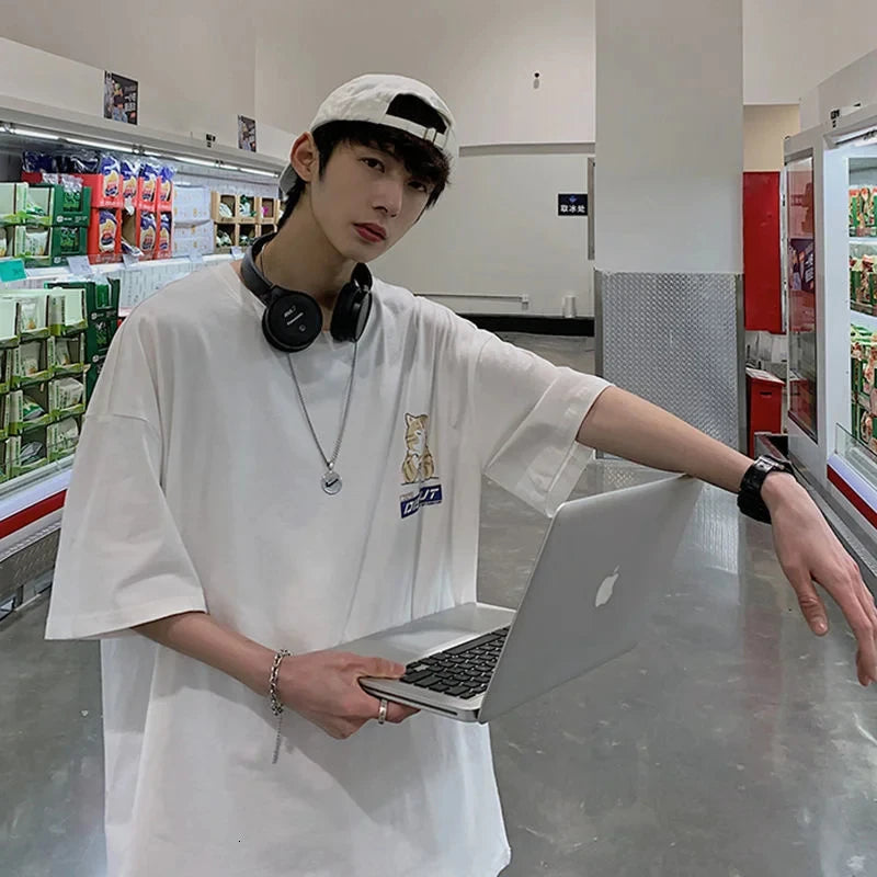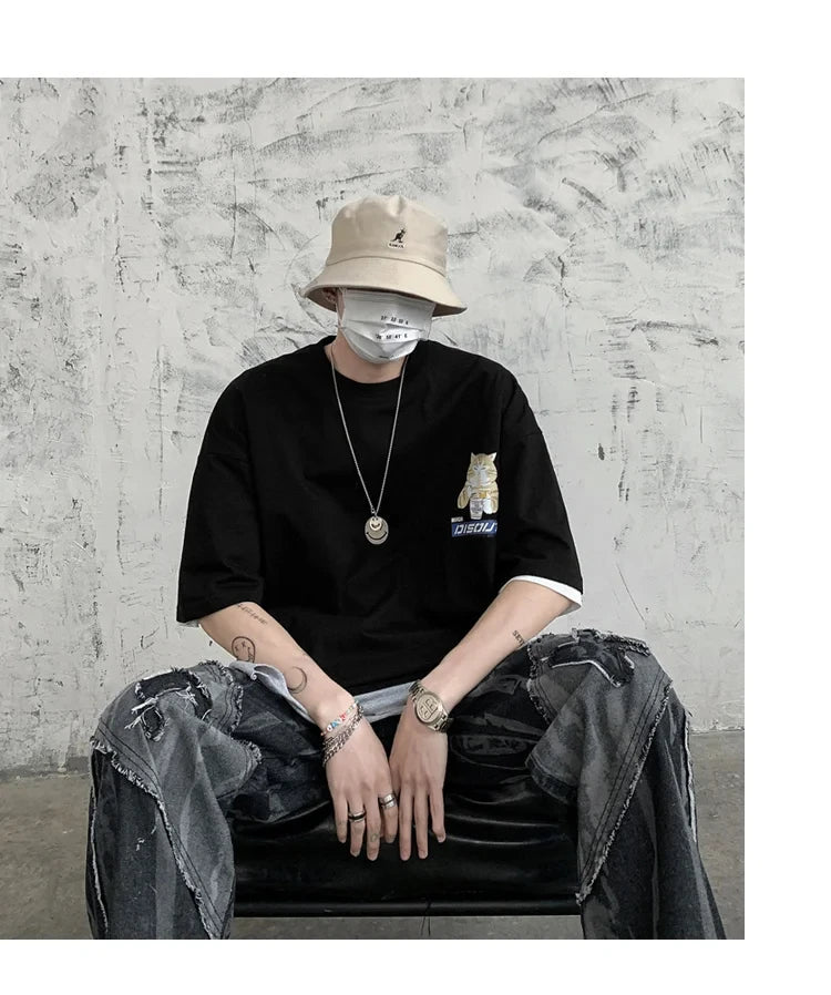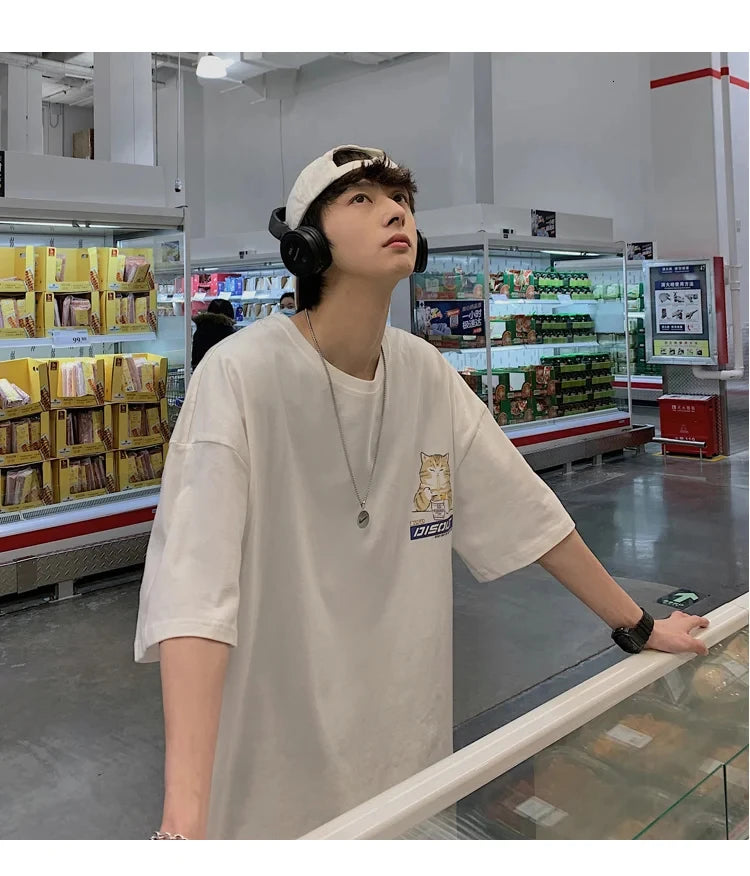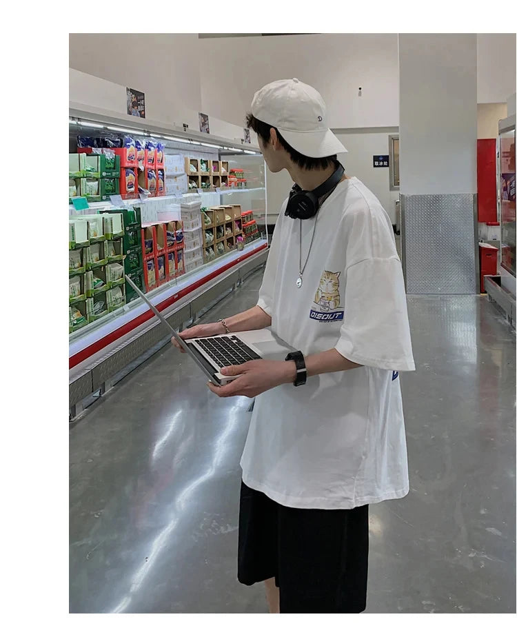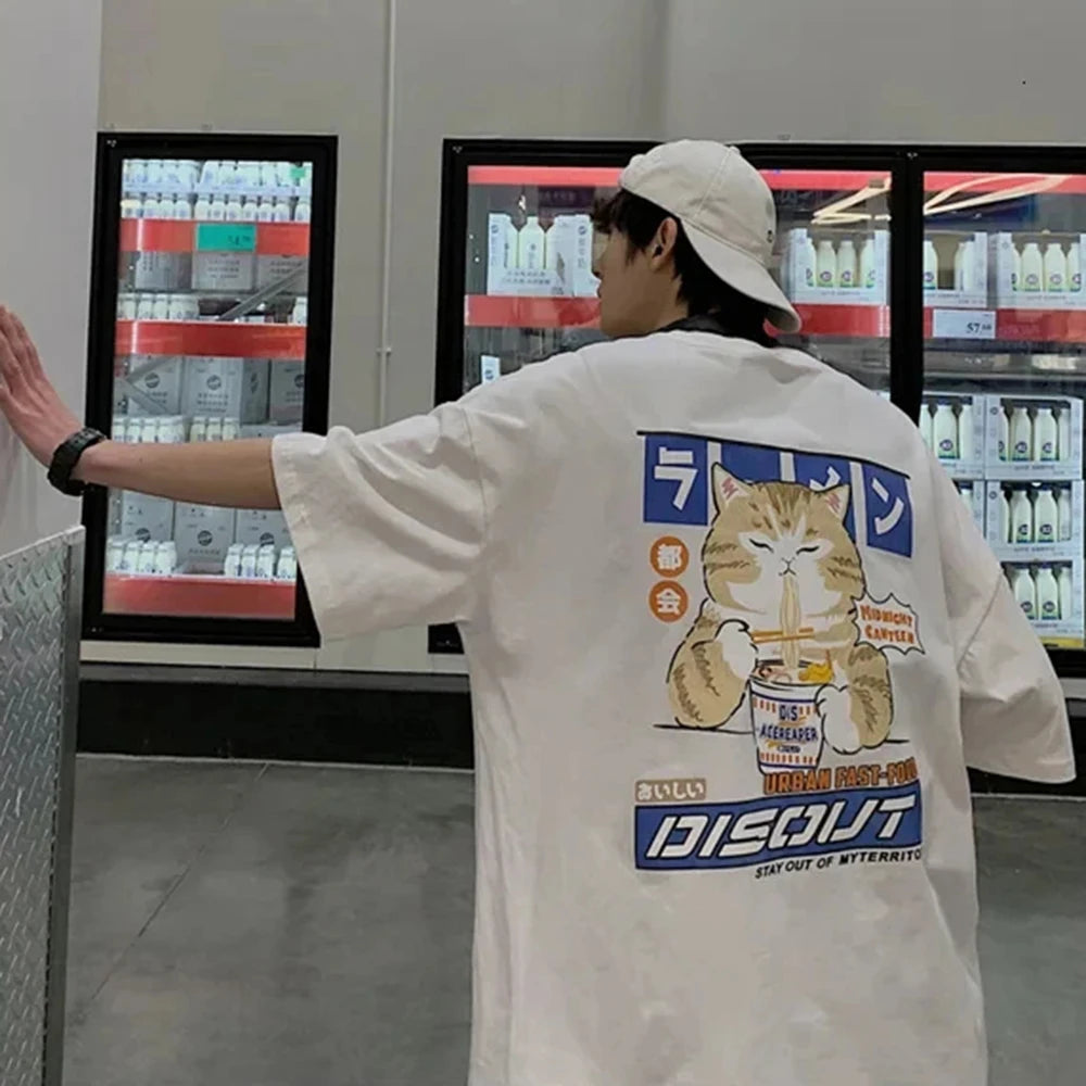 Harajuku Cat Cartoon Eating Noodles Graphic Men Women Tshirts Casual Short Sleeve Tees Japan Style Oversized T Shirt Clothing