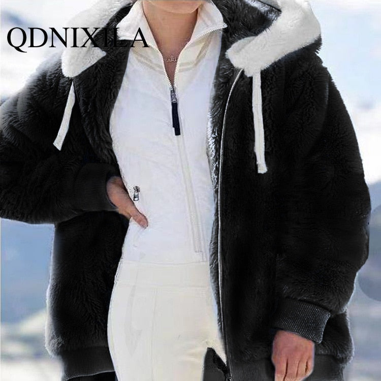 Spring and Autumn Loose Plush Zipper Hooded Jacket Women Coats