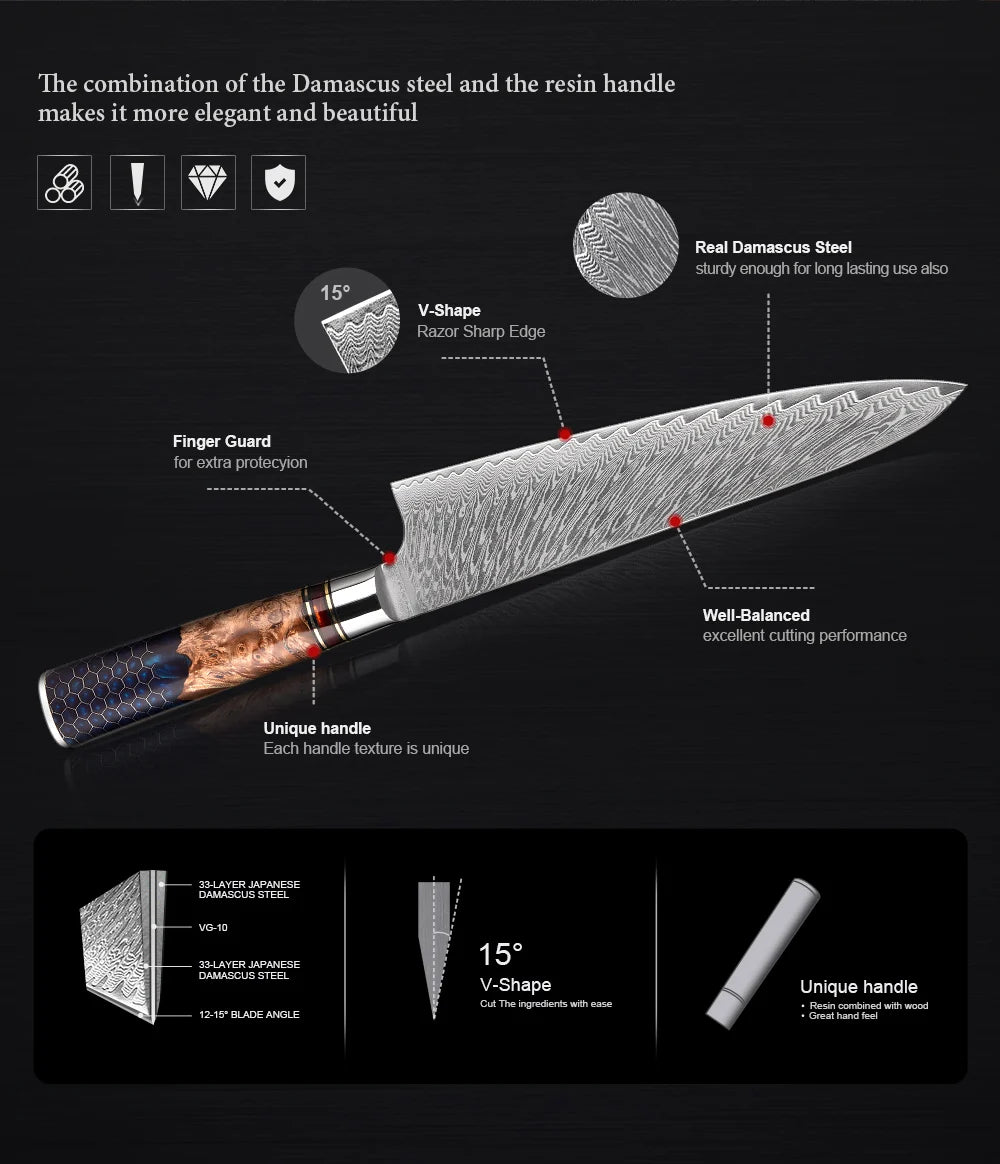 Equip your kitchen with the best chef knife and best cooking knives on the market. Whether you're after a ninja knife set, a nice knife set for daily use, or a complete set of knives for the kitchen, our Damascus steel chef knife set offers the precision, strength, and beauty that you deserve. Trust our store for your kitchen knife set needs and experience the difference of high-quality, professional-grade cutlery.