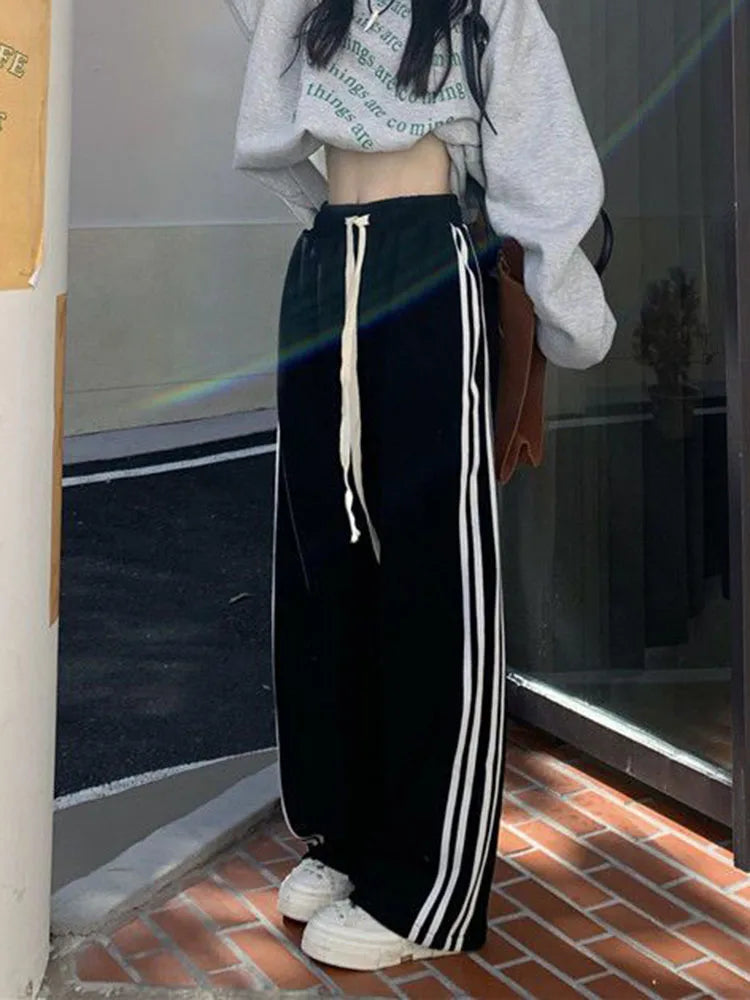 Zoki Black Striped Sweatpants Women Preppy Style High Waist Loose Casual Trousers