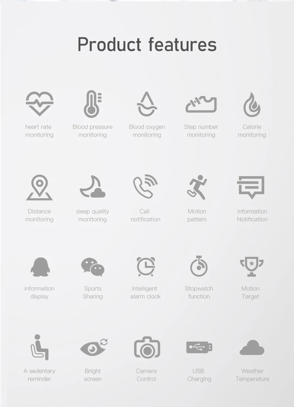 Function: Passometer,fitness tracker,Message Reminder,Call Reminder,Answer Call,Blood Pressure,Alarm Clock