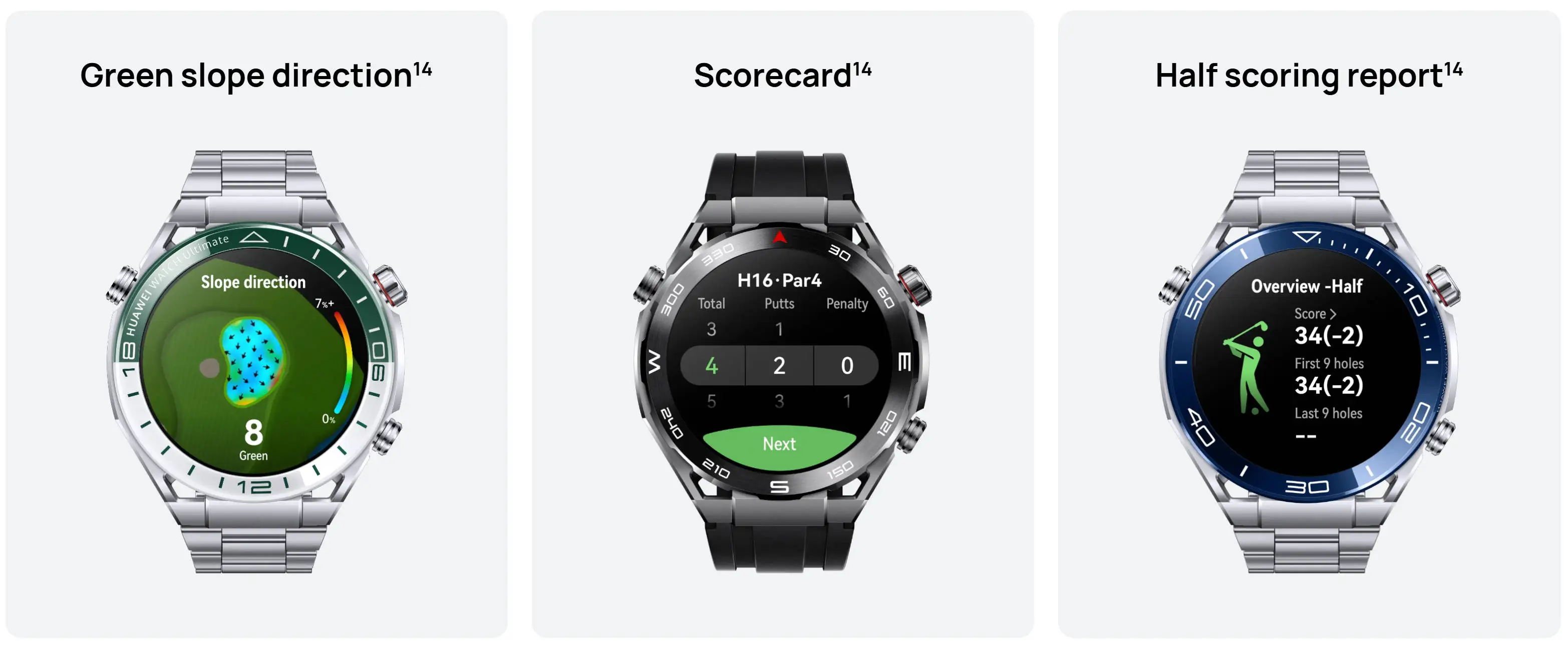 Handy digital scorecards show you all the key data after a half round or the whole 18 holes, including total strokes, putts, penalties, fairway keep ratio, and greens in regulation. You can also easily share the ball's trajectory as a dynamically restored animation, via the Huawei Health app.