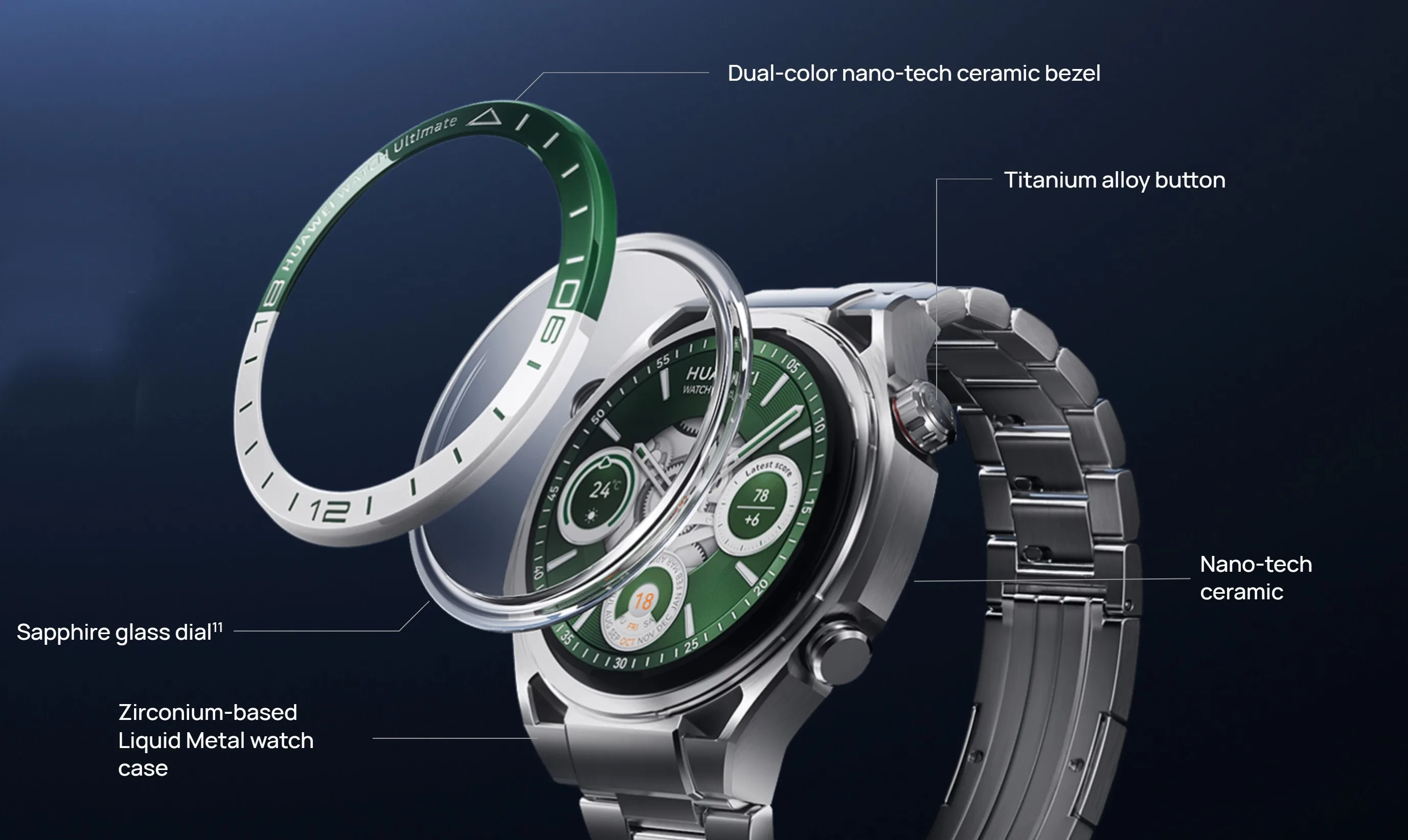 The watch case is made of Zirconium-based Liquid Metal, which is 15.2% lighter than if stainless steel is used to make the case. "A first" refers to a first among all commercially released smart watches as of September, 19th, 2024.