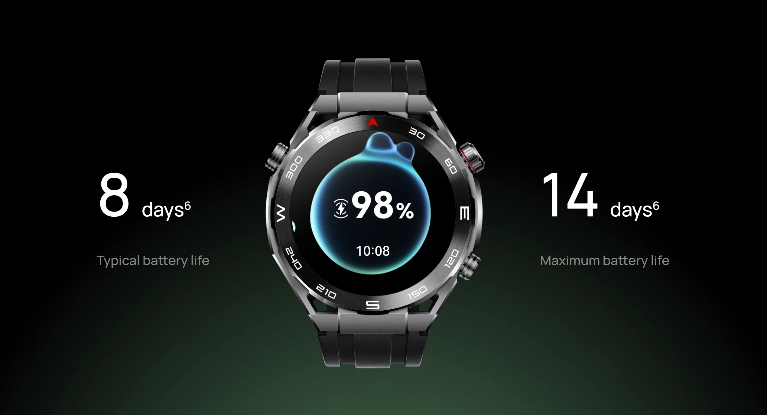 The 14-day maximum battery life is tested under the following conditions: factory default settings, 30 minutes of Bluetooth calling per week, 30 minutes of music playback per week, heart rate monitoring always on, HUAWEI TruSleep™ enabled at night, 90 minutes of exercise on average per week, message notifications enabled (50 messages, 6 calls, and 3 alarms per day), and the device screen turned on 200 times per day (using a preset watch face with power level 1).