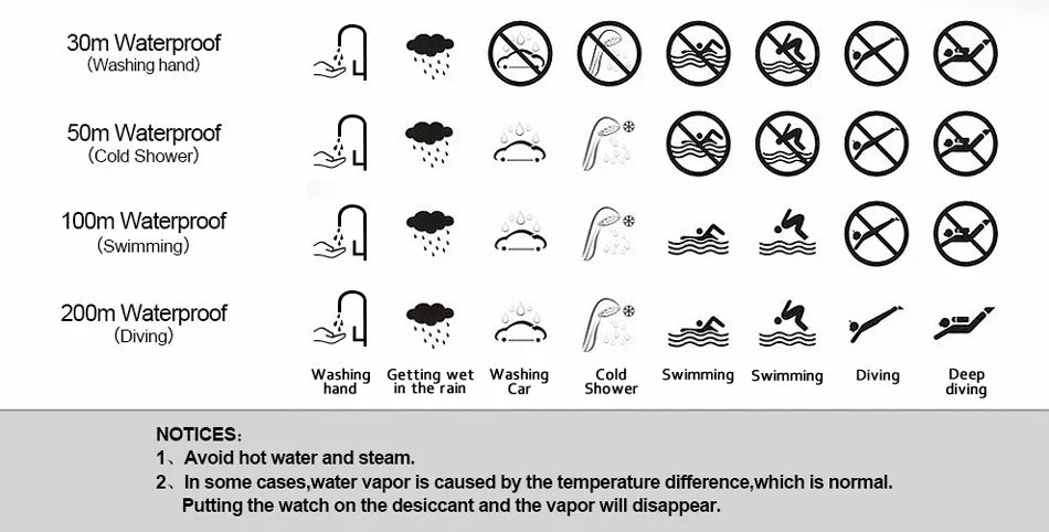 3ATM/30M Water Resistant (Not Support showering, swimming and diving)