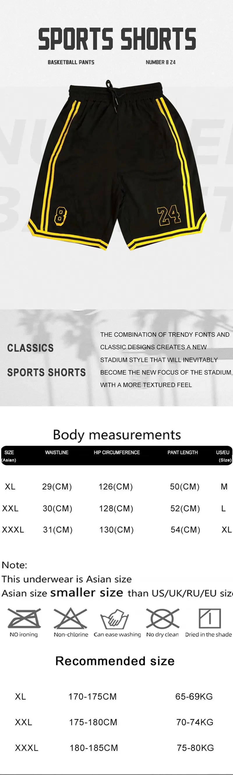 New Summer Men's Shorts Black And Yellow Patchwork No.8 And 24 Basketball Pants Casual Fitness Jogging Street Ball Sweatpants
