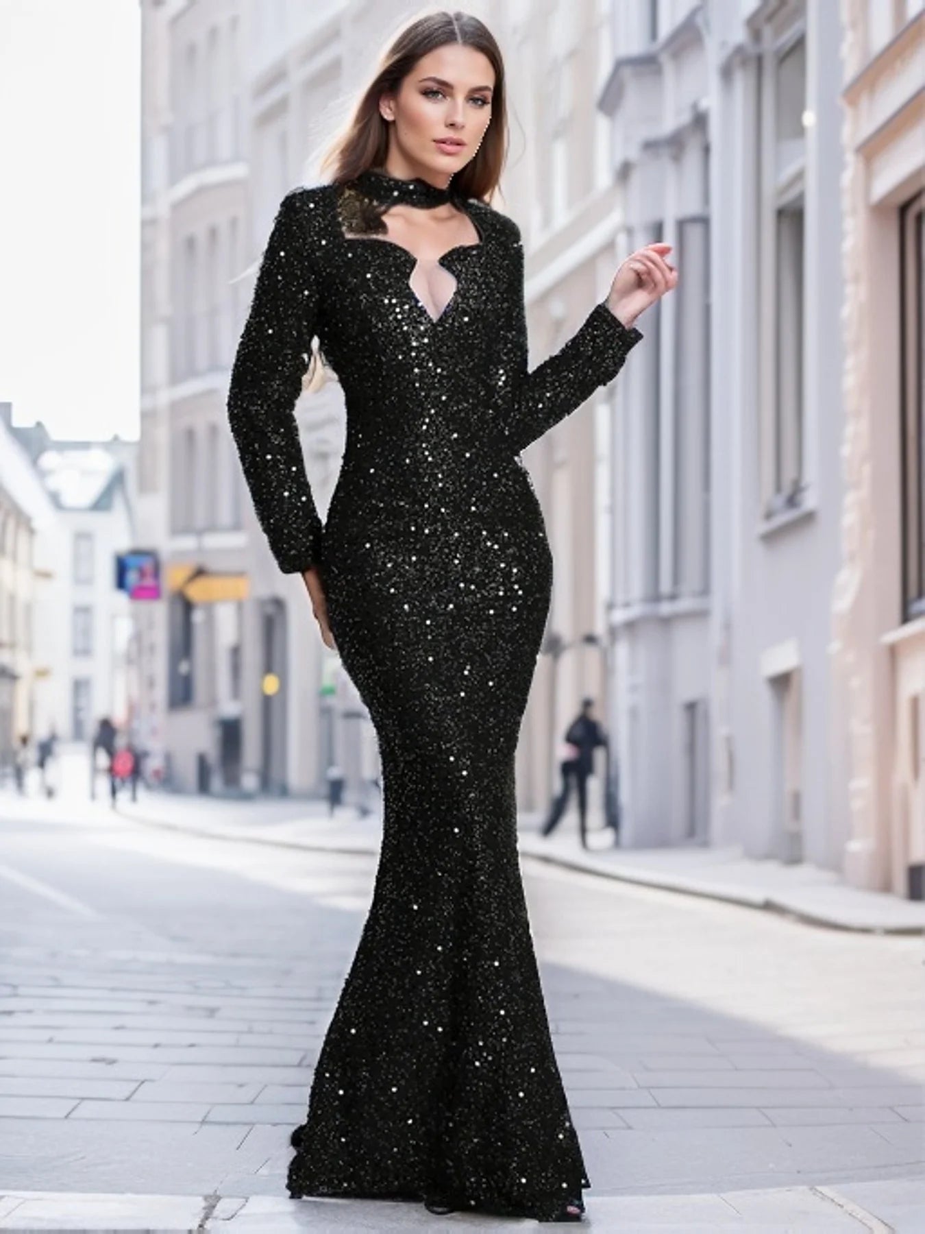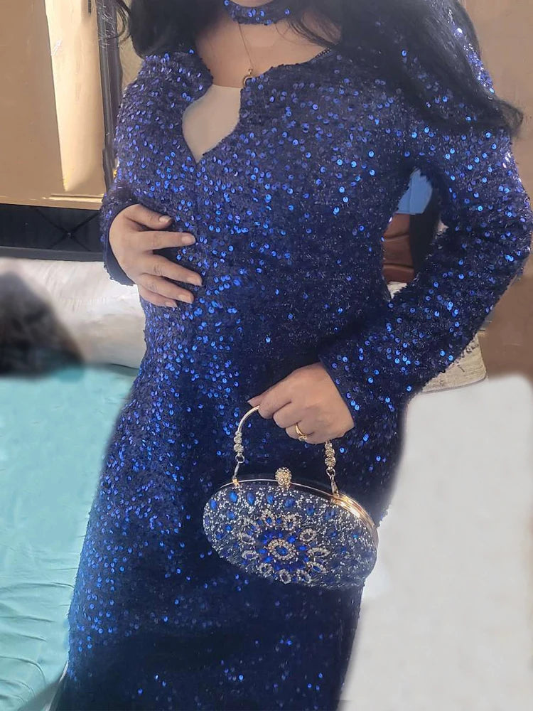 Designed with meticulous attention to detail, this gown boasts a classic O-neck and elegant long sleeves, offering a blend of modesty and allure. Whether you're attending a wedding or an evening party, this gown is guaranteed to make you the center of attention. Its luxurious fabric drapes beautifully, creating a silhouette that flatters every body type, including those looking for petite formal dresses or plus-size options.