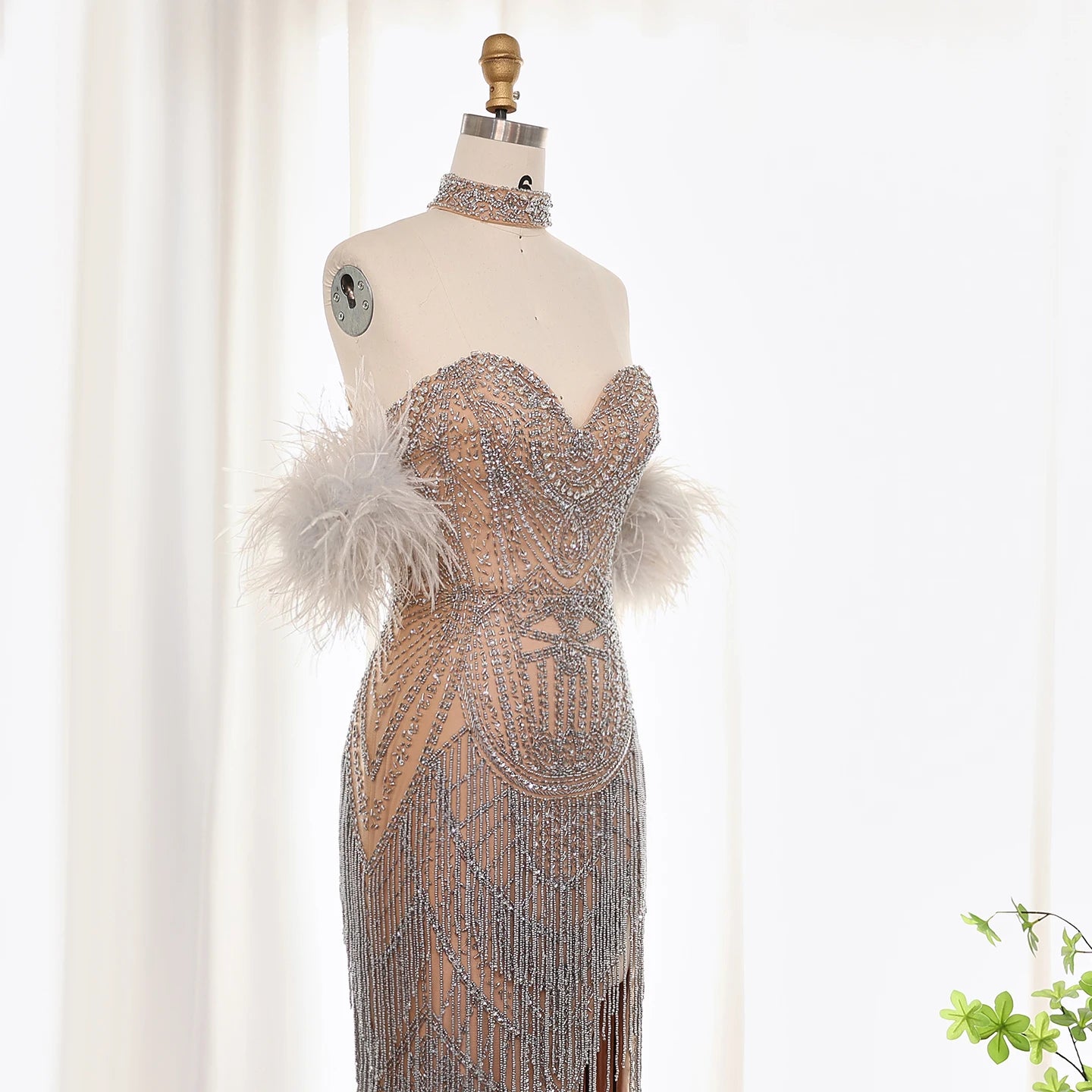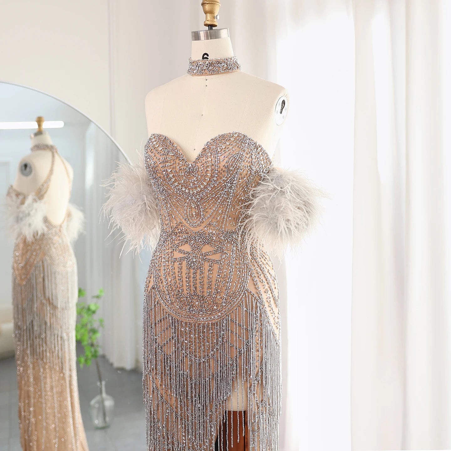 Homecoming Dresses: Unleash Your Inner Starlet in Our Tassel Feather Silver Nude Mermaid Evening Dress