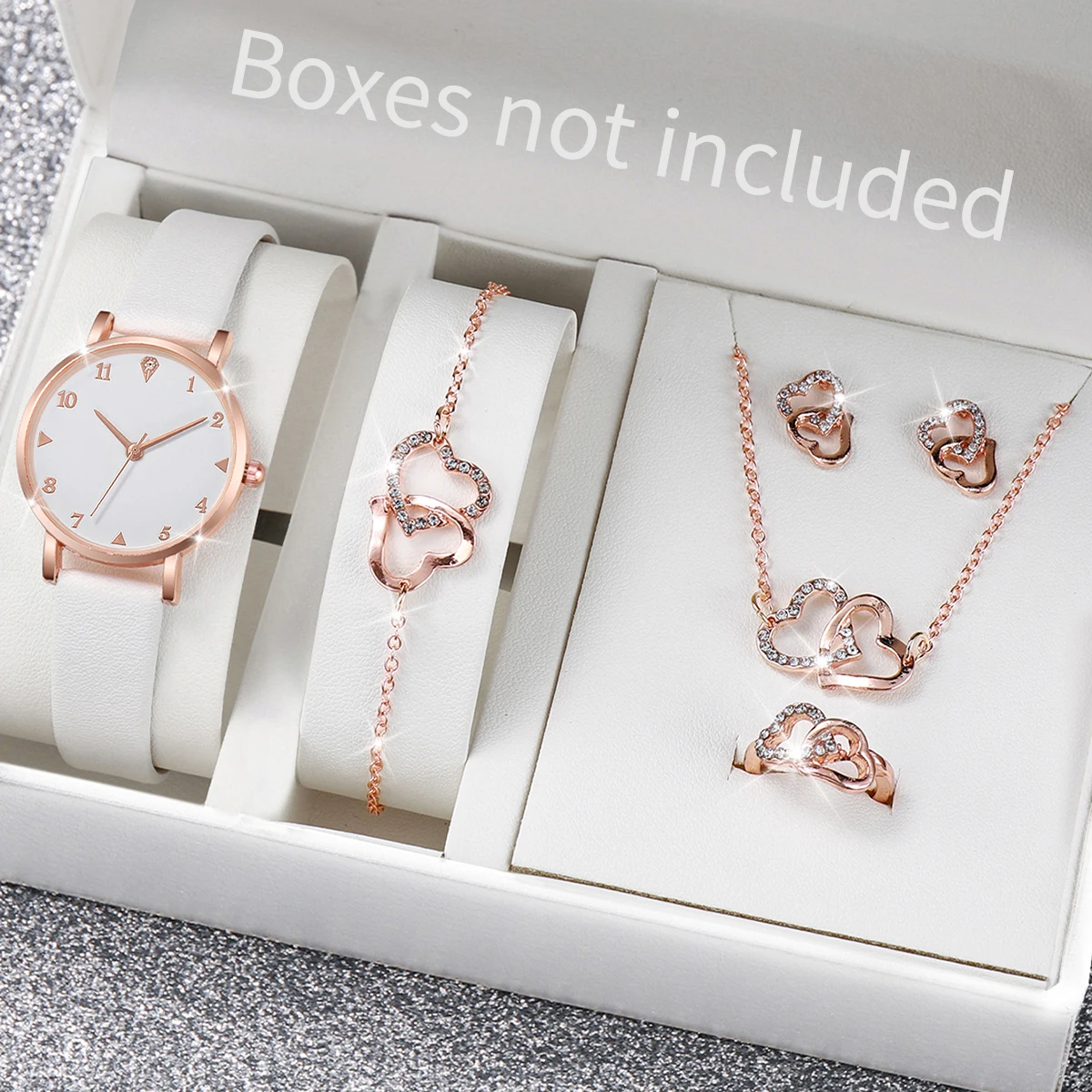 6PCS/Set Fashion Women's Watch Leather Band Quartz Watches Double Heart Jewelry Set(Without Box)