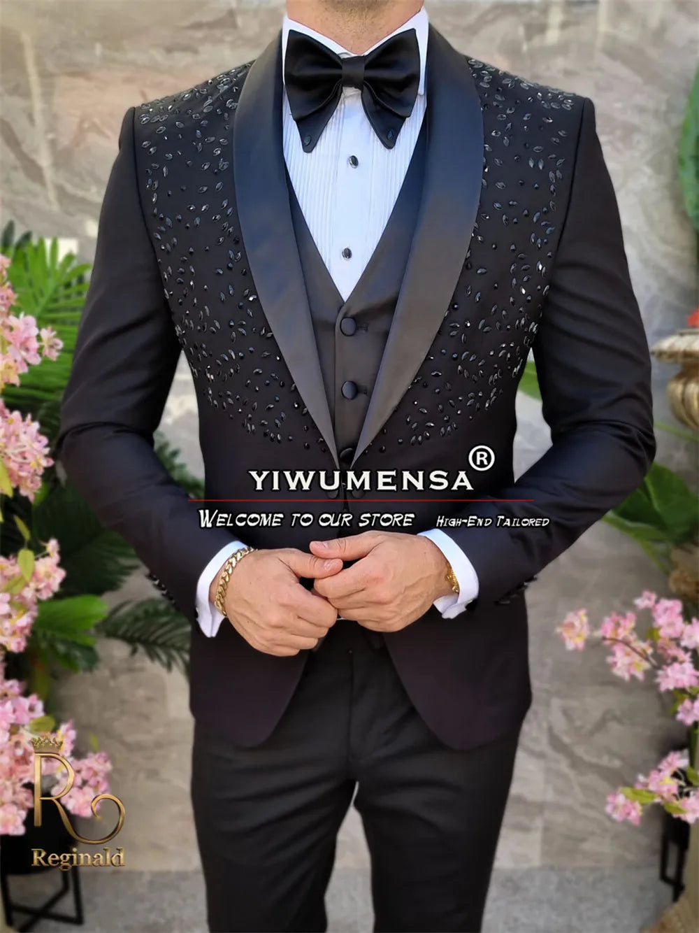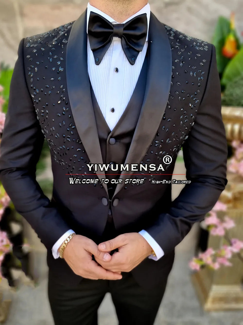Our black wedding suit is a testament to meticulous craftsmanship and attention to detail. The high-quality fabric drapes beautifully, providing a comfortable and flattering fit. The hand-sewn crystal and gemstone beads are strategically placed to catch the light, creating a mesmerizing sparkle that will captivate everyone's attention. This suit is perfect for those seeking the best wedding suits for men or the best wedding suits for groom.