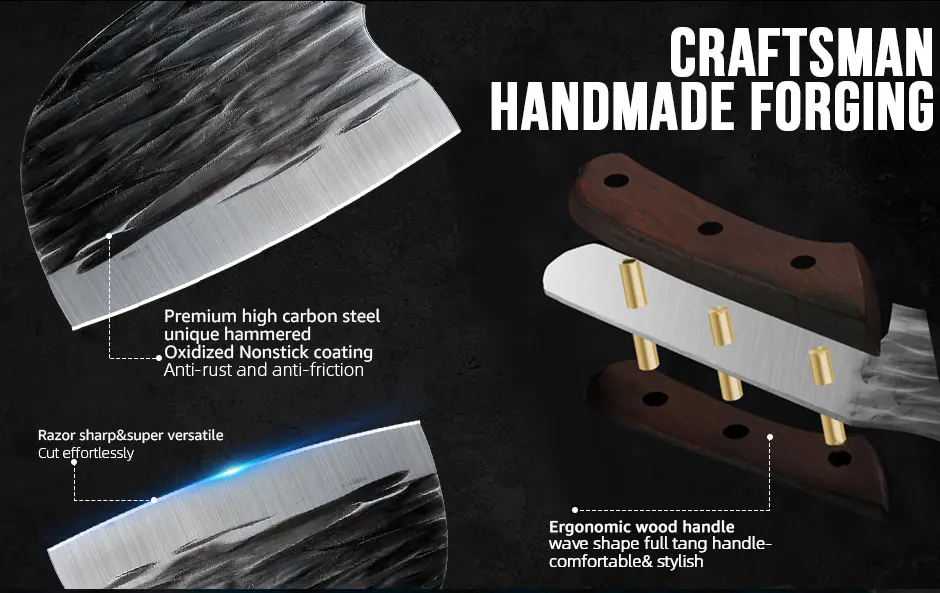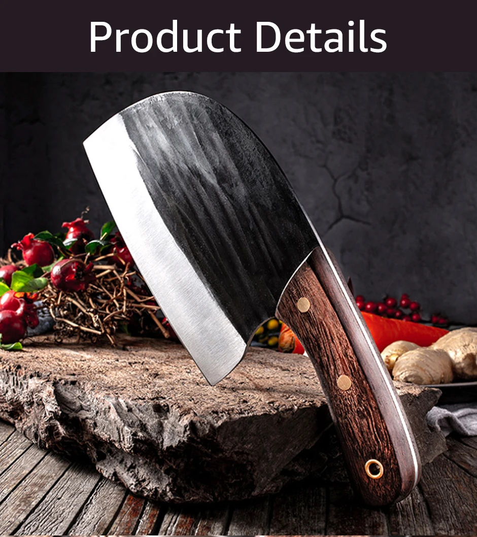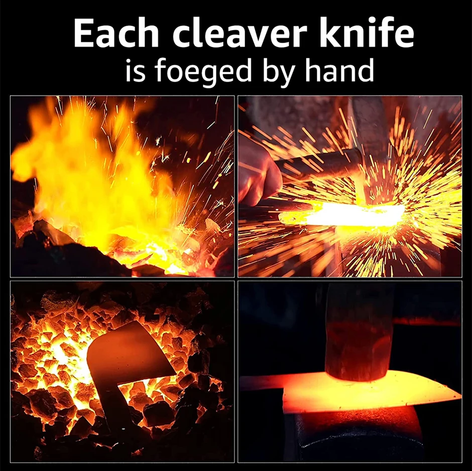 2. [Multipurpose & Premium Material]---- The butcher's knife is forged from 58hrc high manganese steel 4cr13. The 15 ° edge blade is sharp and durable.