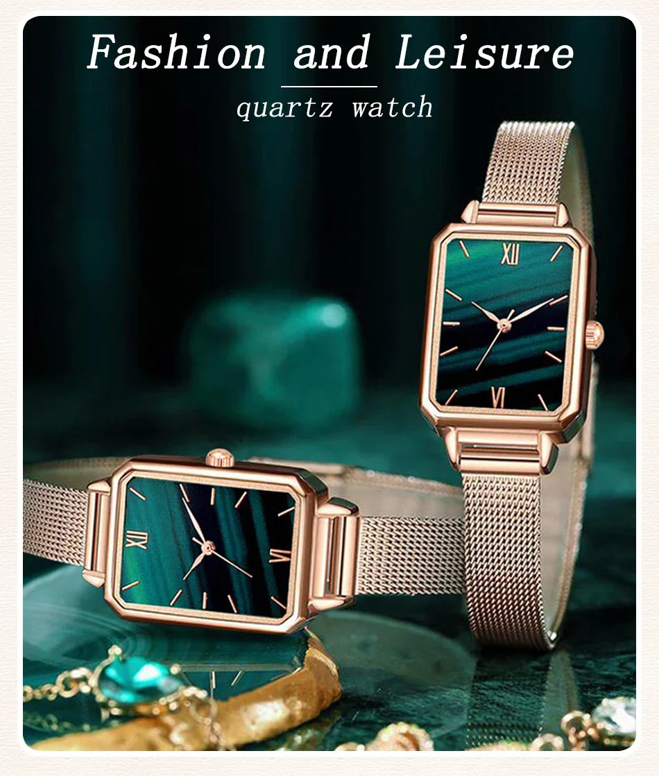 Women Watches Fashion Square Ladies Quartz Watch Bracelet Set Green Dial Simple Rose Gold Mesh Luxury Women Watches