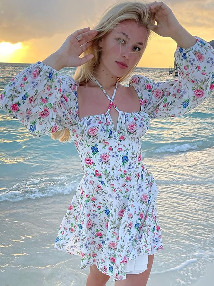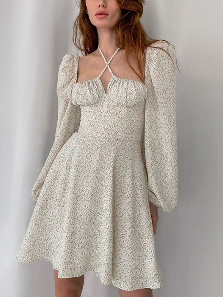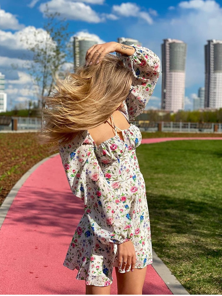 Floral Dress Women Lantern Long Sleeve Ruched Print A Line Square Neck Tie Up
