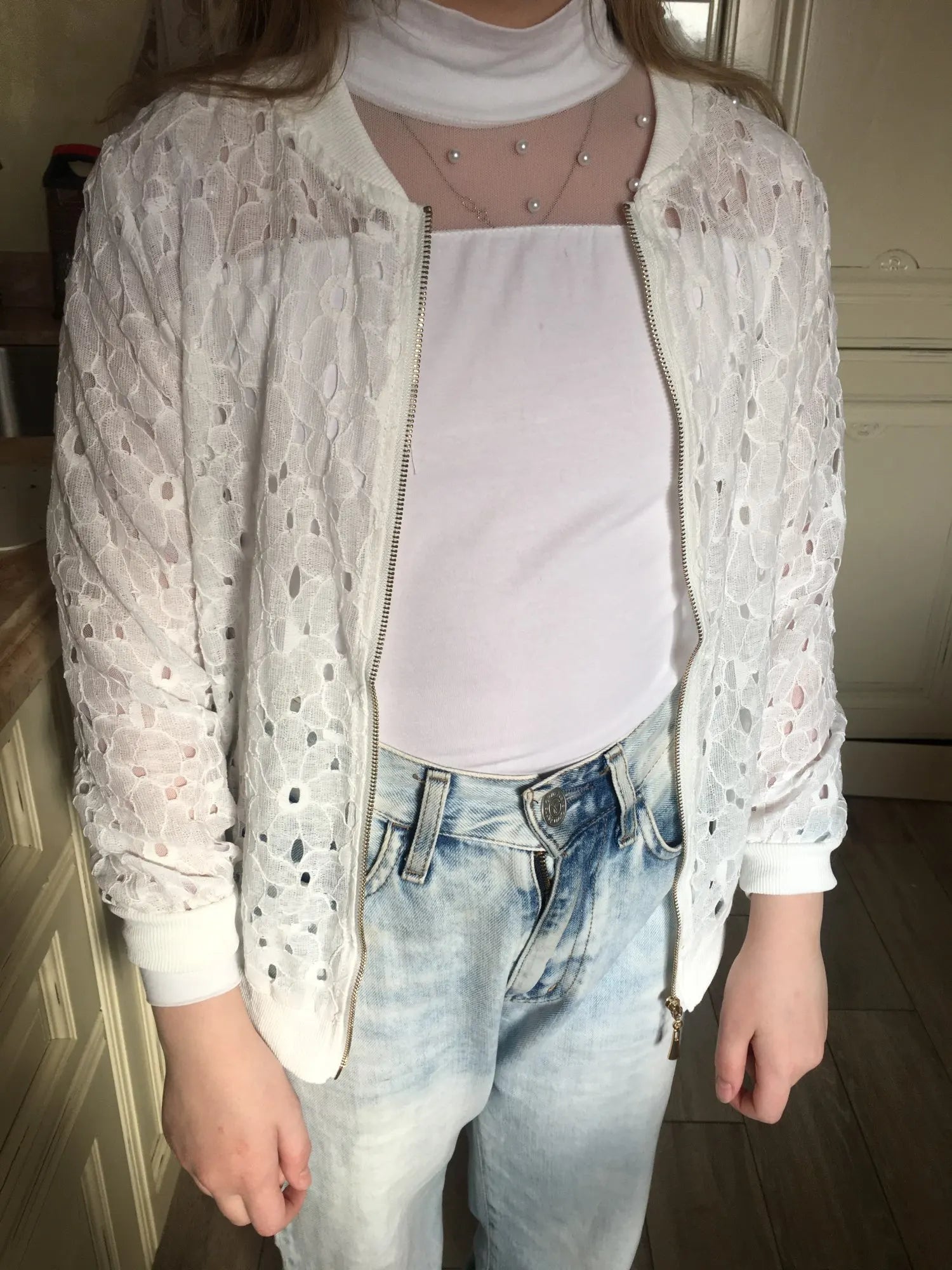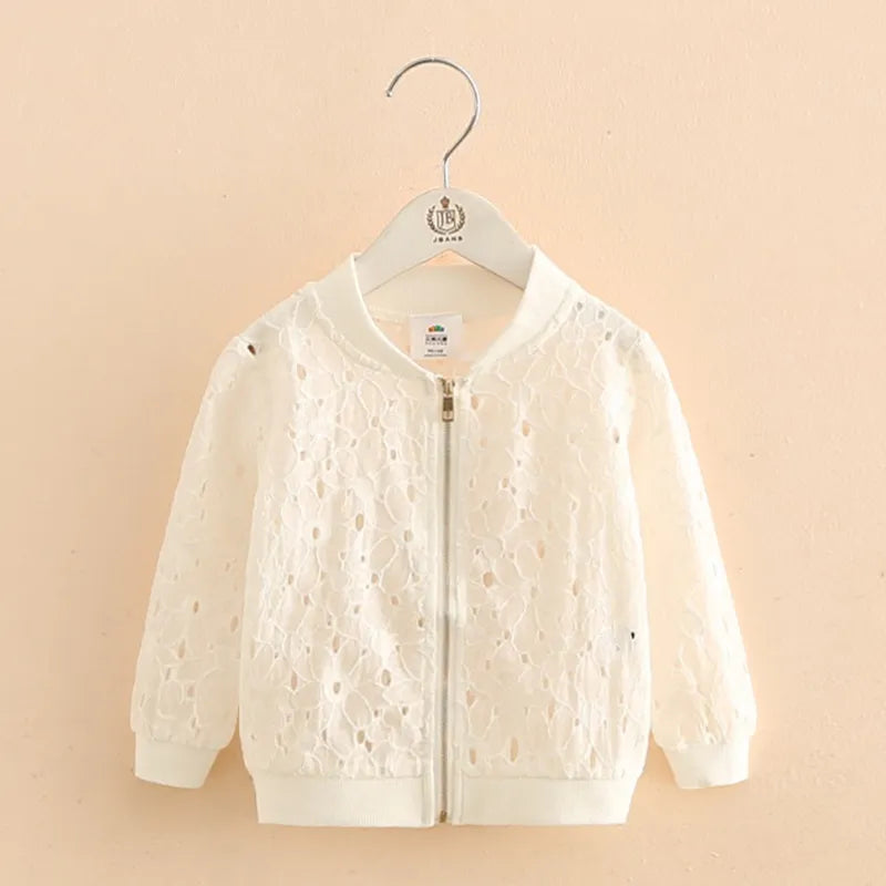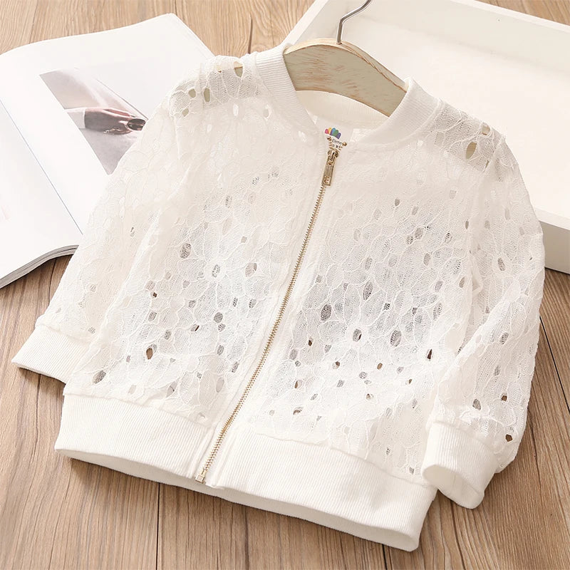 New Spring Autumn Summer 2 3 4 6 8 10 12 Year Long Sleeve Sunscreen White Flower Hollow Out Kids Baby Girl Baseball Jacket