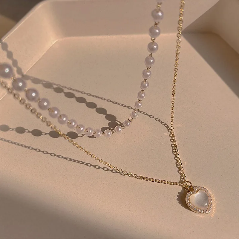 Cute Love Heart Shaped Pendant Necklace Pearl Chain Shiny Fashion Women Aesthetic