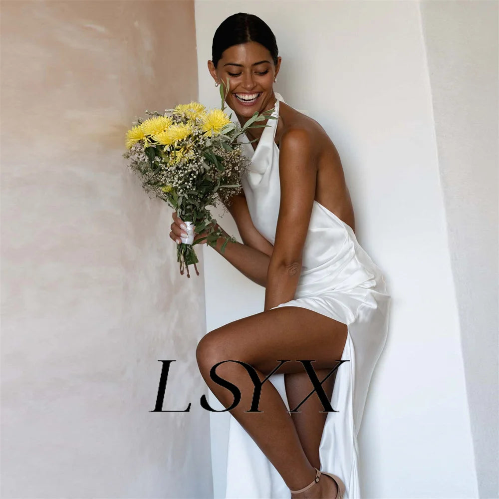The gown’s sleek satin material highlights your figure with its mermaid silhouette, while the dramatic high side slit offers a contemporary twist. The open-back detail adds a touch of sensuality, creating a unique yet refined look that’s perfect for everything from grand receptions to intimate beach weddings. With its versatile style, this dress is ideal for bridesmaids, wedding guests, and fashion-forward brides alike.