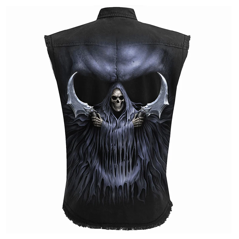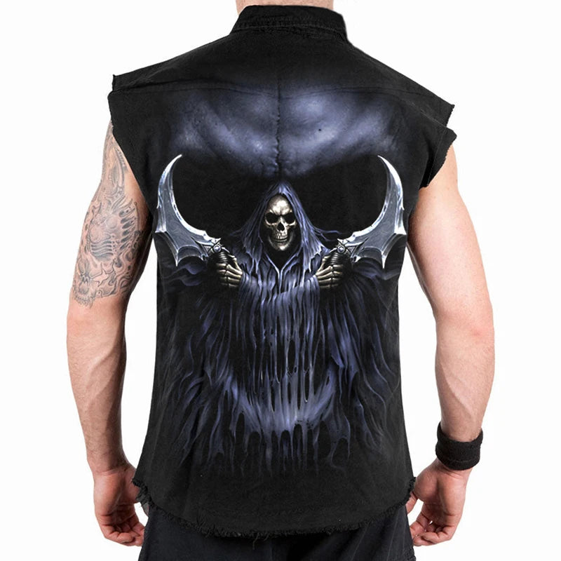 Men's Denim Blouse Retro 3D Skull Graphic Print Sleeveless Shirt Fashion Pocket