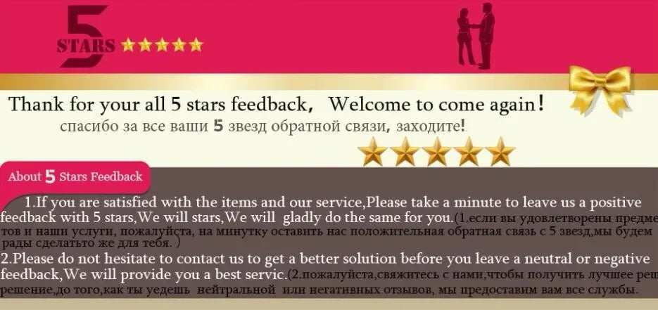 When you received package and like it, kindly confirm received order and leave a positive feedback with full stars for us,If you have any questions, please contact us before you leave poor feedback, we promise to solve all the problems for you, thank you!