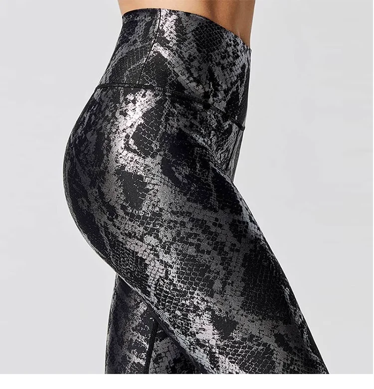 - Striking Metallic Finish: Our leggings feature a unique retro metallic snake print that adds a bold touch to your workout attire. Stand out in any class or gym session with these eye-catching leggings that are sure to turn heads.