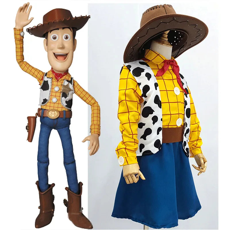 This fun and vibrant costume is inspired by the beloved Toy Story characters, combining the iconic Buzz Lightyear look with a whimsical Woody-inspired cow print design. The dress includes colorful details and playful accents that capture the spirit of the characters, ensuring your child stands out at any event.