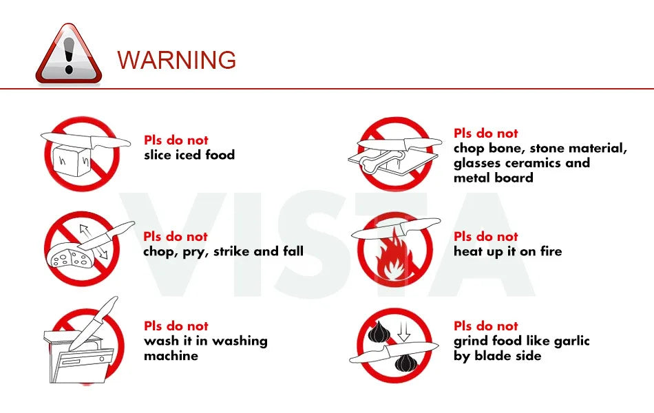 avoid cutting frozen food or on the surface of marbles, glass and steel board.