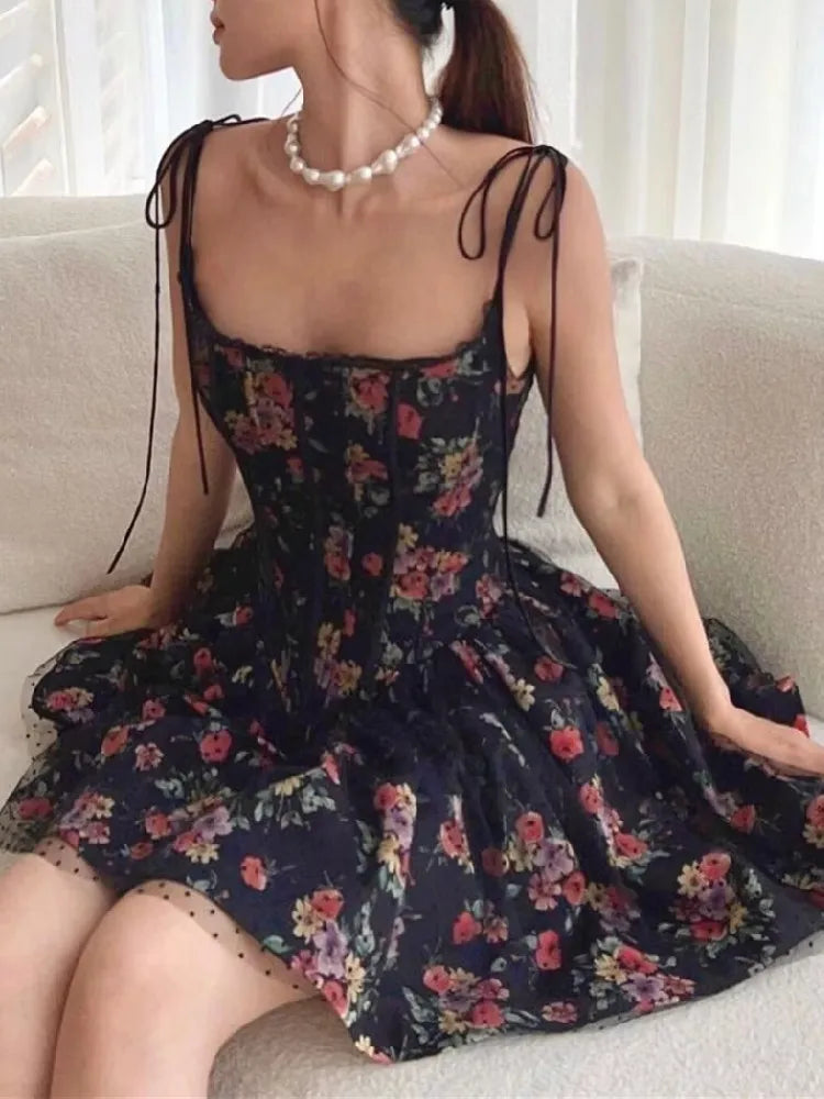 Elevate your fashion game with our Women Black Flower Print Spliced Mesh Bra Corset Style Mini Dress. Shop now and experience the blend of classic beauty and contemporary design that makes this dress a standout choice for any occasion.