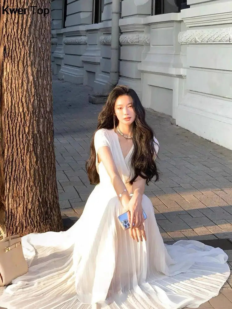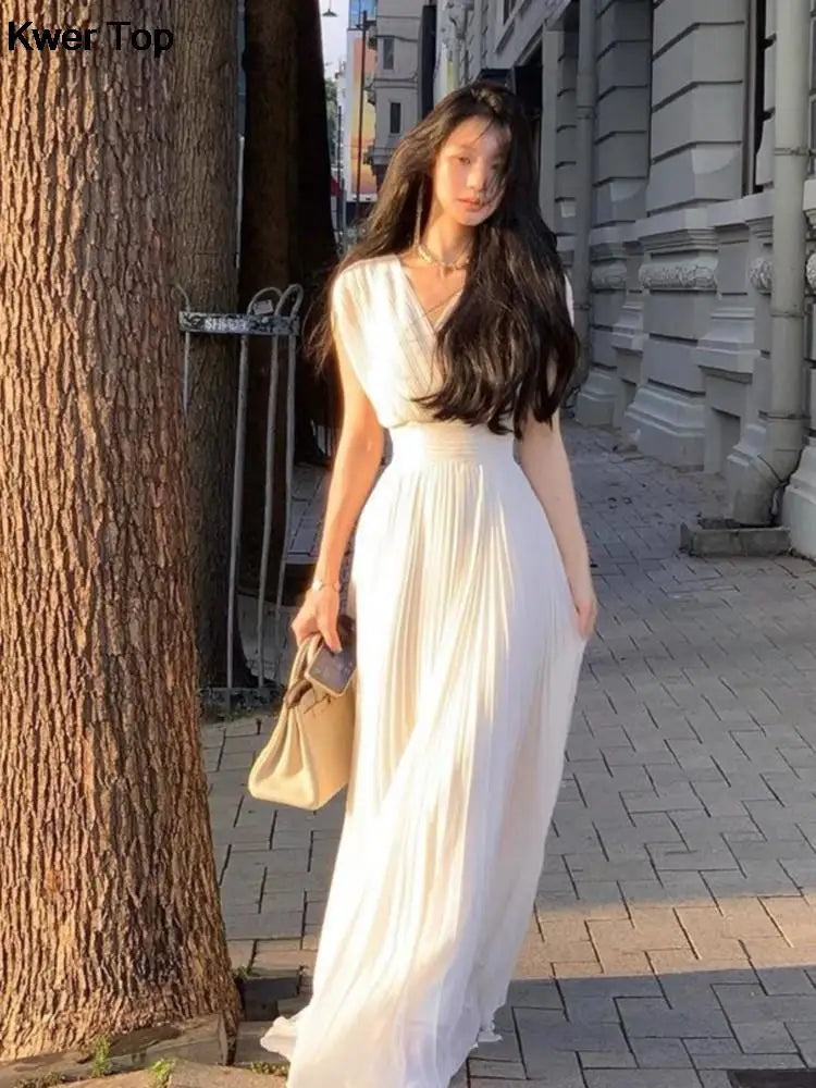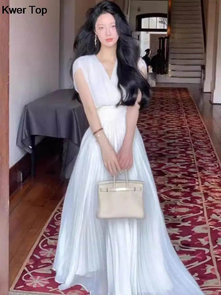 Elevate your wardrobe with our Summer Solid Pleats Long Dresses. This French-inspired, elegant V-neck dress is perfect for any holiday party or casual outing. Crafted from high-quality synthetic fiber, this dress offers both comfort and style, making it a must-have for every fashion-forward woman.