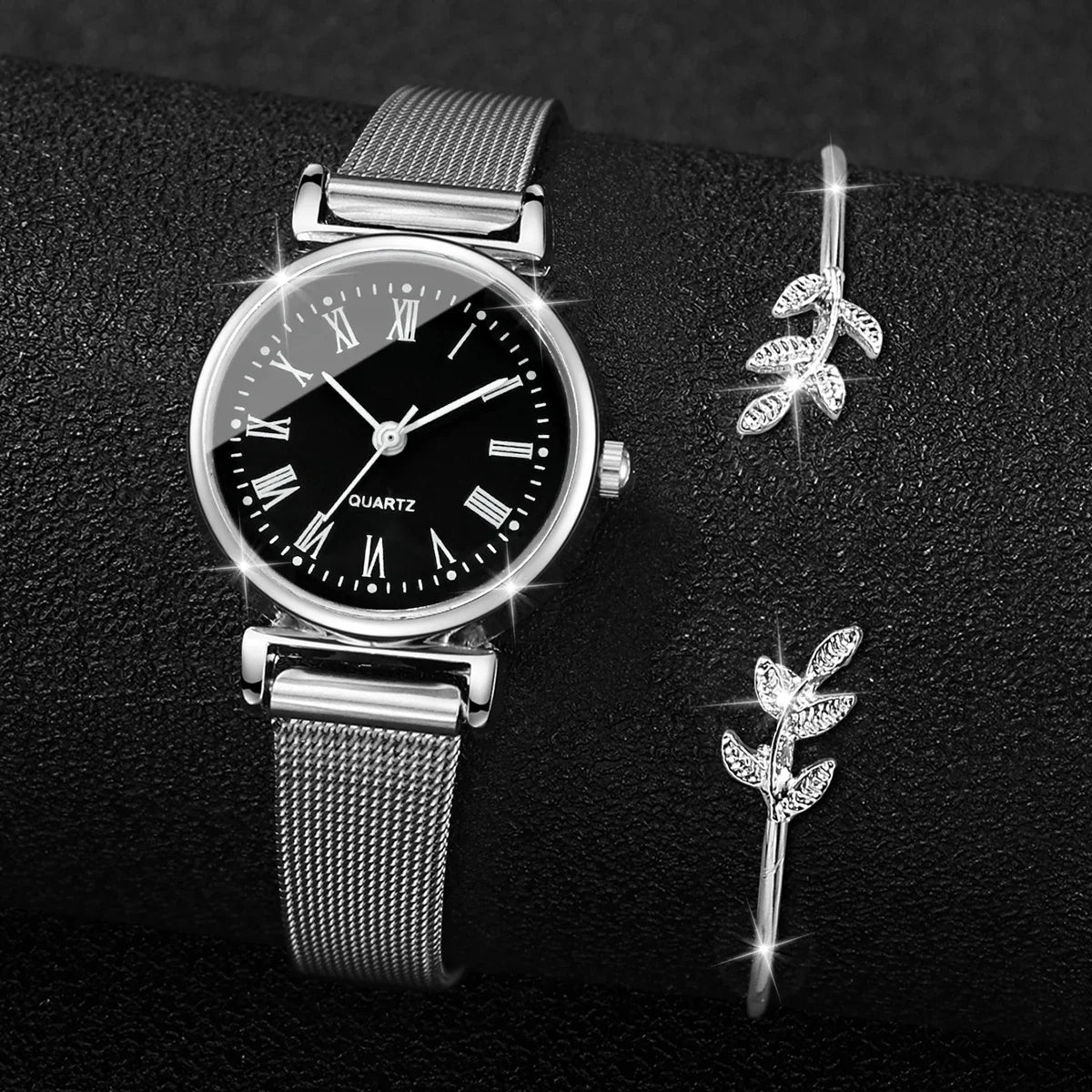 2PCS Fashion Women Quartz Watch Steel Mesh Band Watches Opening Cuff Bracelet Bangle Set(Without Box)