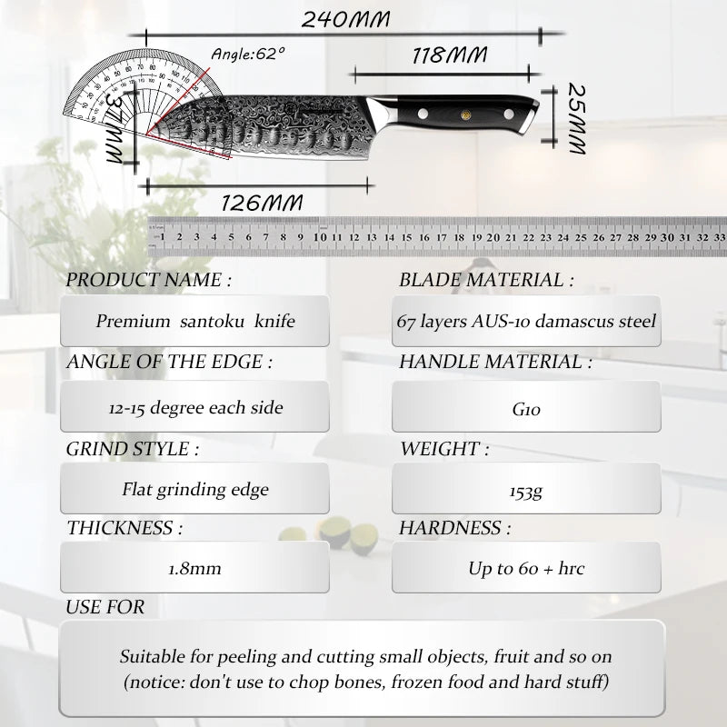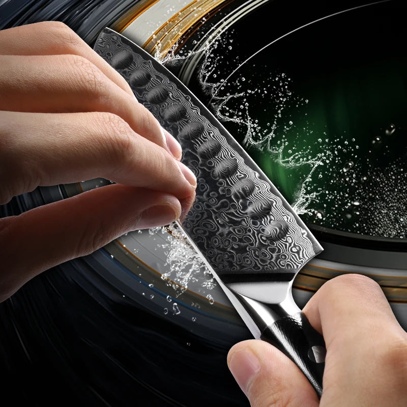 Introducing the 5-Inch Santoku Knife from our store, a stunning example of Japanese craftsmanship and innovation. Made with 67 layers of premium Damascus stainless steel, this knife not only stands out for its beauty but also offers exceptional performance, making it an essential addition to any set of cutlery.