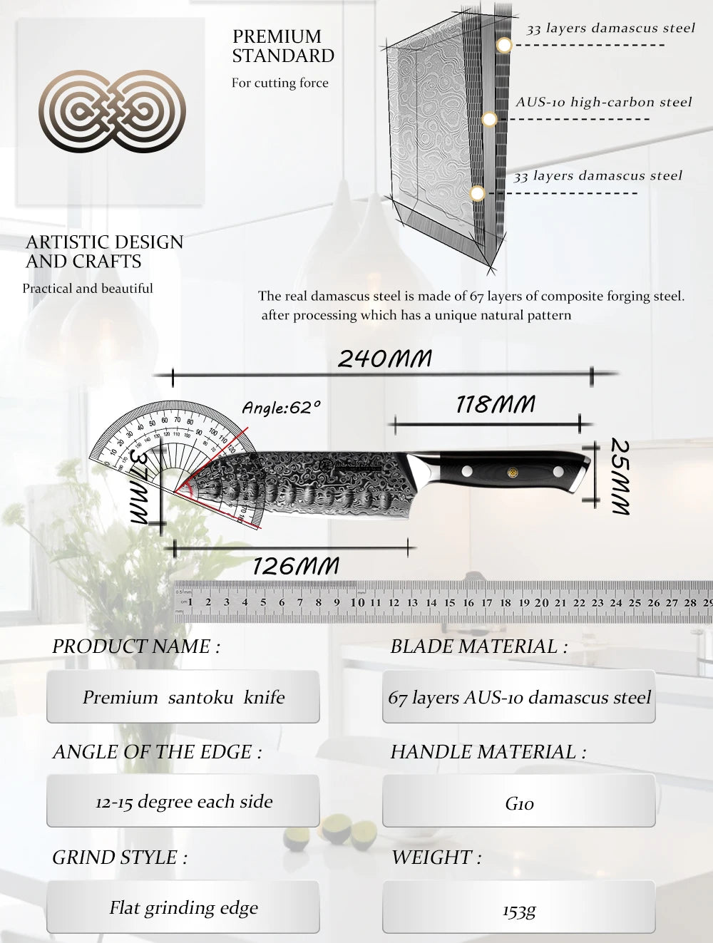 - 67 Layers of Damascus Steel: The unique construction not only enhances durability but also provides an elegant, eye-catching finish.