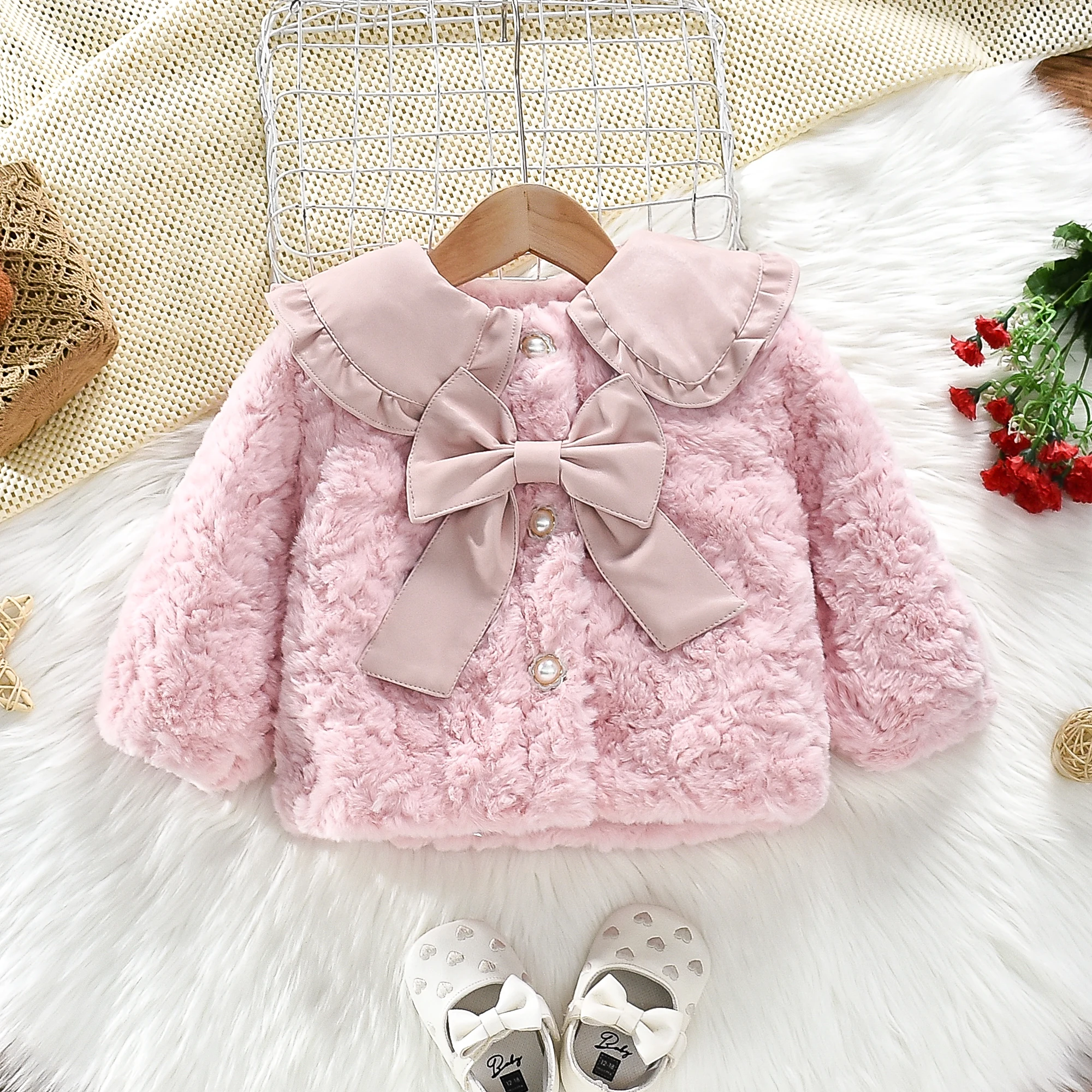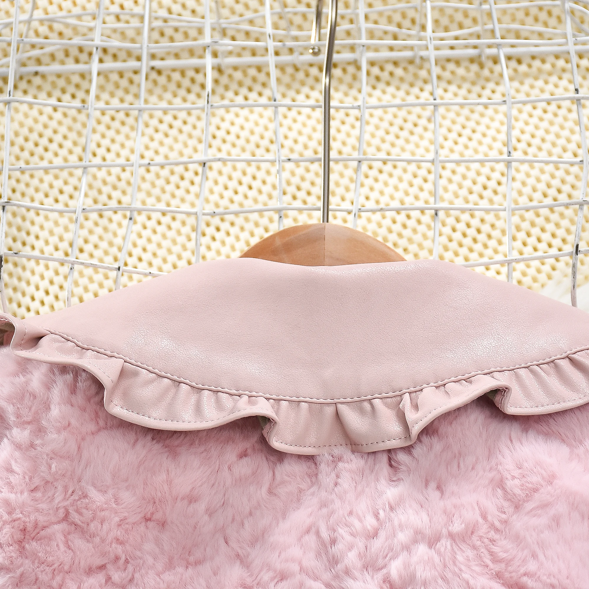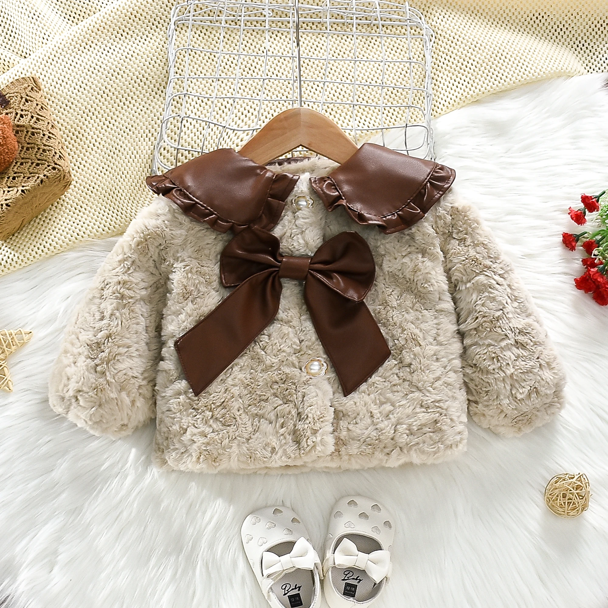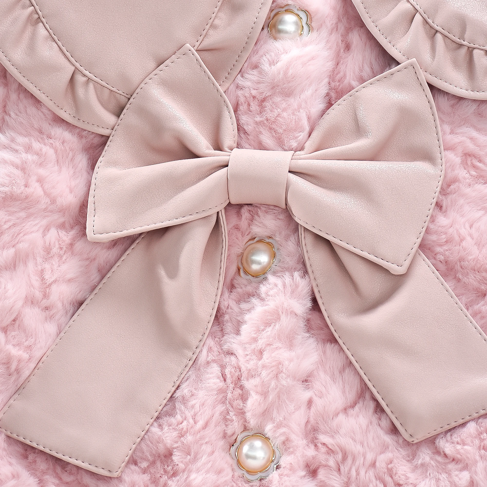 Children's Wear Bow Lapel PU Splice Solid Color Sweet Thickened Coat