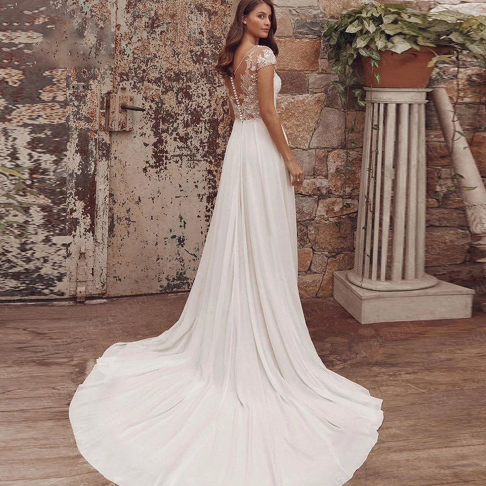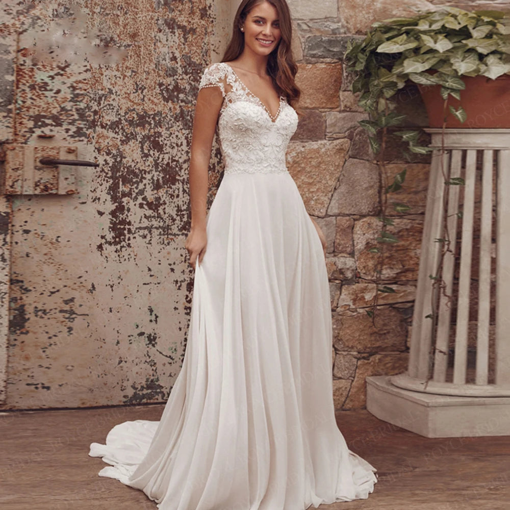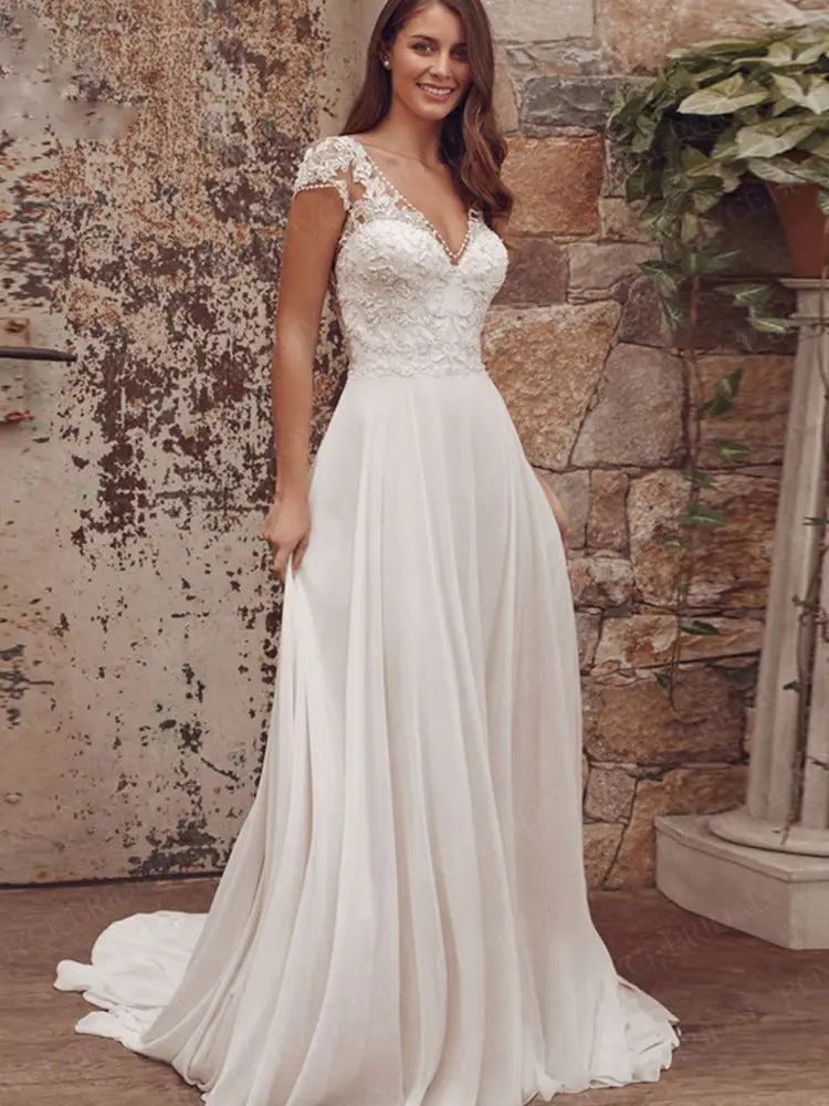 This dress isn’t just stunning; it’s also practical! The cap sleeve design offers both modesty and style, while the V-neckline flatters a variety of body types. Whether you're looking for petite dresses for a wedding or searching through cheap wedding dresses options, this is a luxurious, budget-friendly choice. Its lace texture makes it a standout option for bridal boutiques near me or wedding shops near me, saving you from endless scrolling for “the one.”