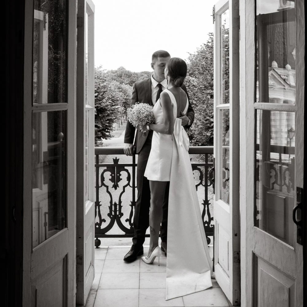 This gown’s carefully tailored boho wedding dress style brings a unique vibe to weddings of all sizes and themes. The large bow detail adds a dash of bold yet playful sophistication, effortlessly making it the centerpiece of your bridal party. The V-neckline ensures a timeless silhouette that complements any body type, whether you're exploring options for plus size wedding dresses, petite dresses for wedding, or a universally appealing style.