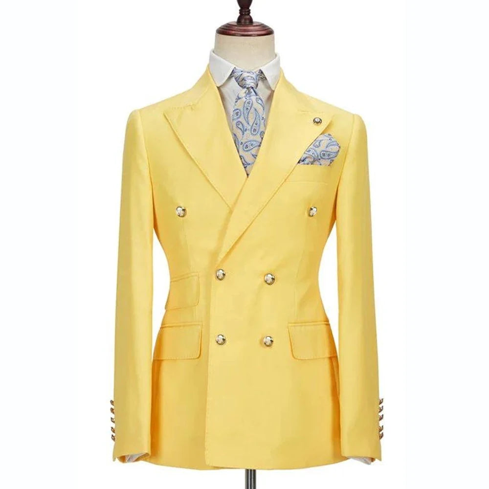 Step into the spotlight and redefine groomsmen style with our captivating Yellow Suits for Men Chic Terno Double Breasted Peak Lapel Elegant. This isn't just a suit; it's a statement, a burst of sunshine crafted to elevate your wedding party’s ensemble. For those seeking a departure from the traditional, this vibrant yellow suit offers a refreshing and unforgettable aesthetic.