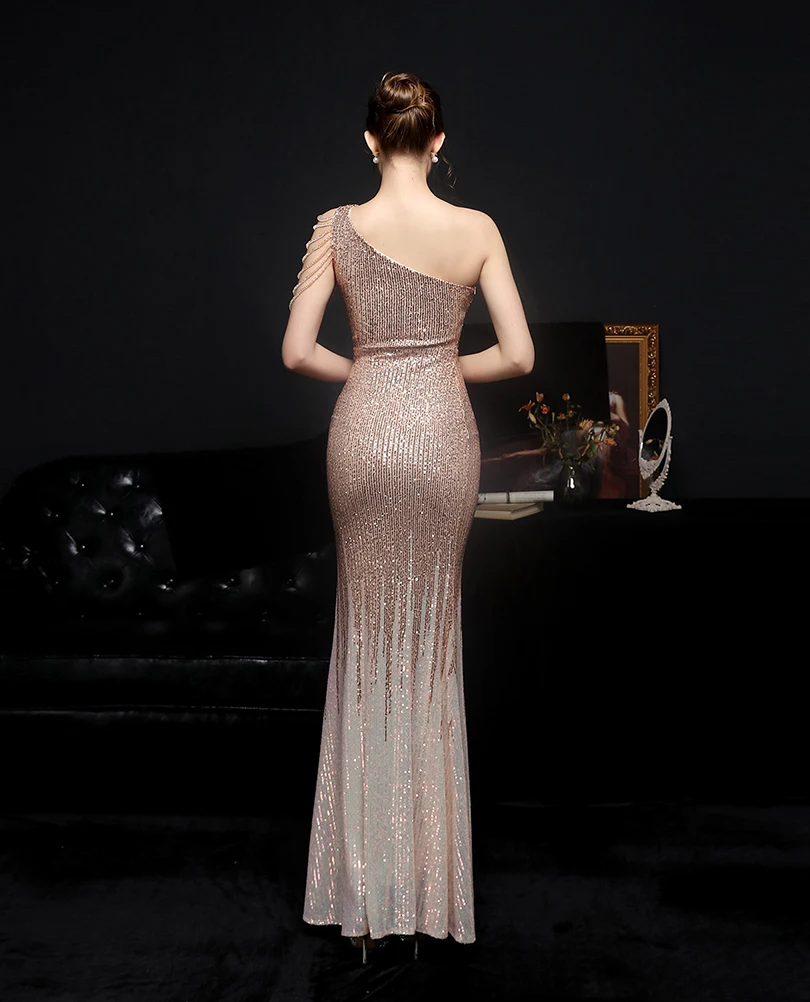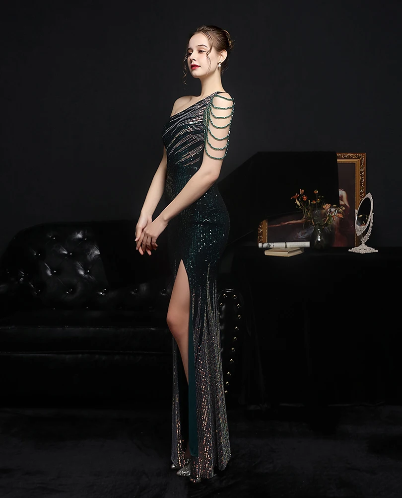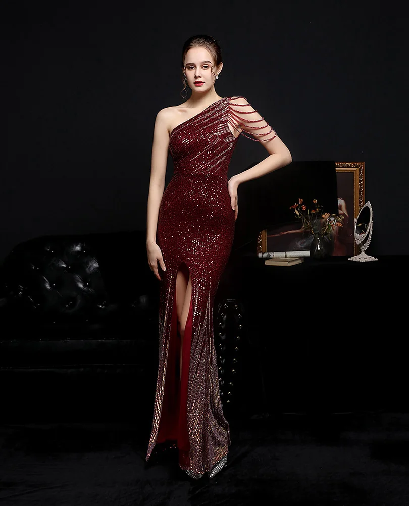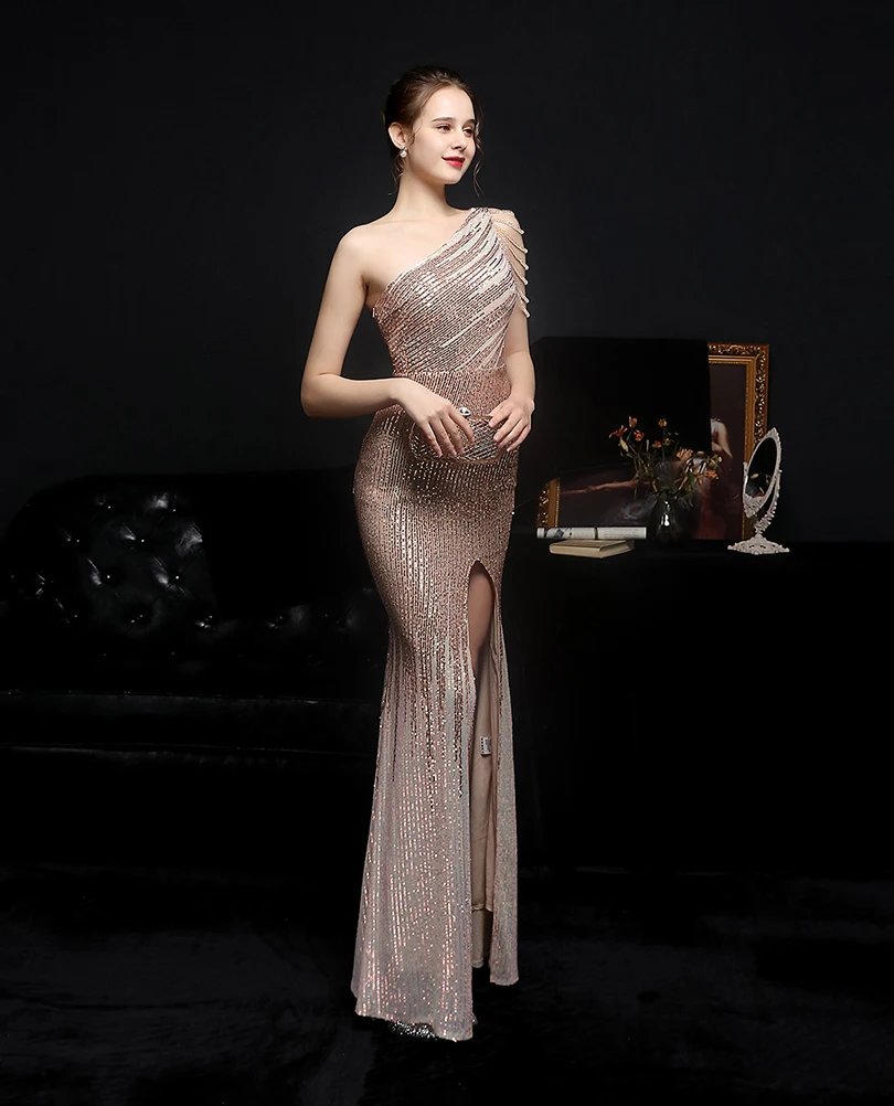 Introducing the One Shoulder Split Evening Dress Long Sequins Mermaid, a stunning gown designed to captivate and charm at any formal event. This exquisite dress combines timeless elegance with modern sophistication, ensuring you stand out and feel confident. Whether it's a wedding, prom, or any special occasion, this dress is your ultimate choice for a glamorous and unforgettable look.