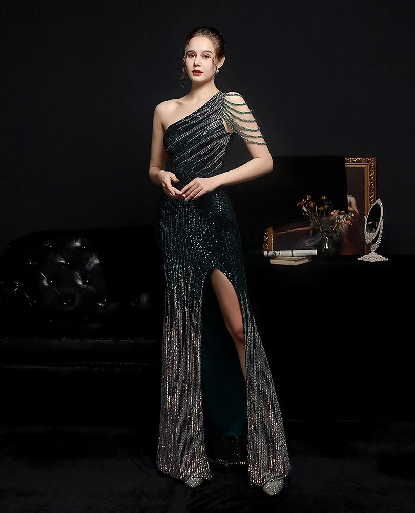 Our collection of evening dresses is designed to cater to every event on your social calendar. Whether you're looking for spring formal dresses or party dresses for women, the One Shoulder Split Evening Dress Long Sequins Mermaid is the ideal choice. Make your birthday unforgettable with the perfect birthday dress for women. This gown is also a fantastic option for easter dress women and semi formal dresses for women, adding a touch of elegance to any festive event.