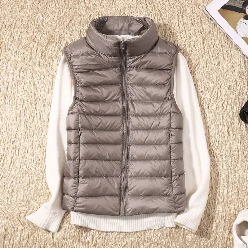 Crafted from premium materials, this female puffer jacket offers unbeatable warmth while remaining ultra-light. The ladies goose down jacket filling ensures superior insulation, trapping heat efficiently, and the sleeveless design allows for unrestricted movement, making it ideal for active wear or casual outings. The minimalist design of this duvet jacket enhances its versatility, allowing you to pair it with various outfits effortlessly.