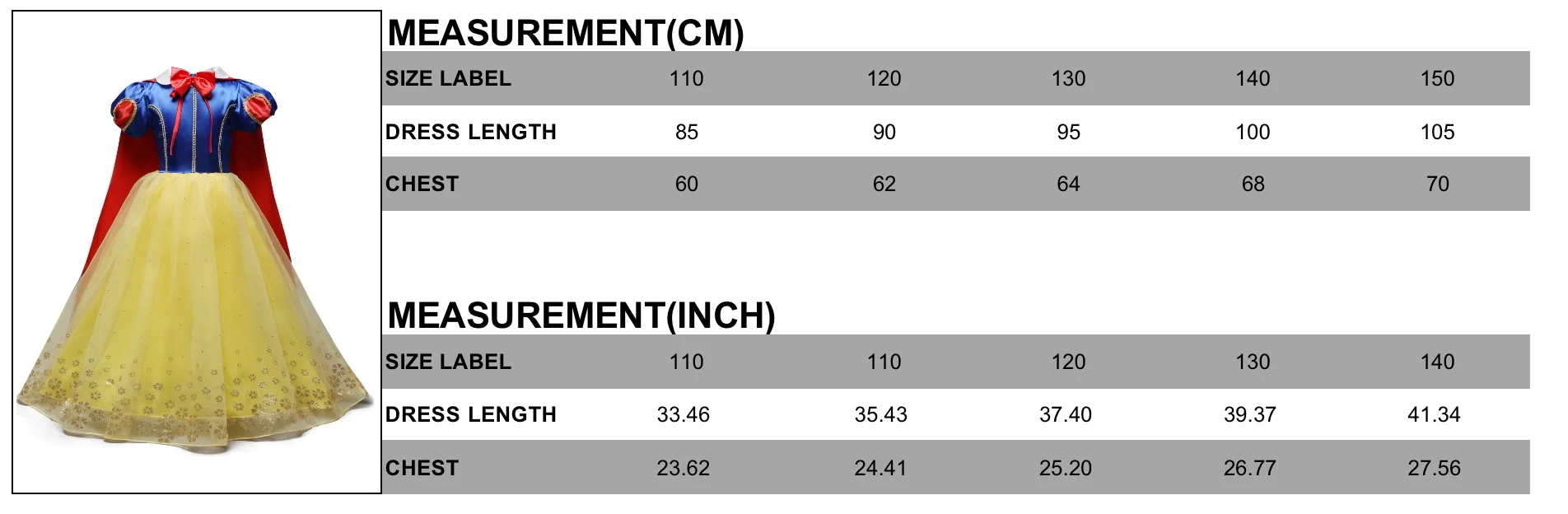 - Classic Snow White Design: Inspired by the beloved Snow White character, this dress features vibrant colors and classic details that capture the essence of the fairy-tale princess. The elegant design is perfect for making your child feel like she’s stepped out of a storybook.