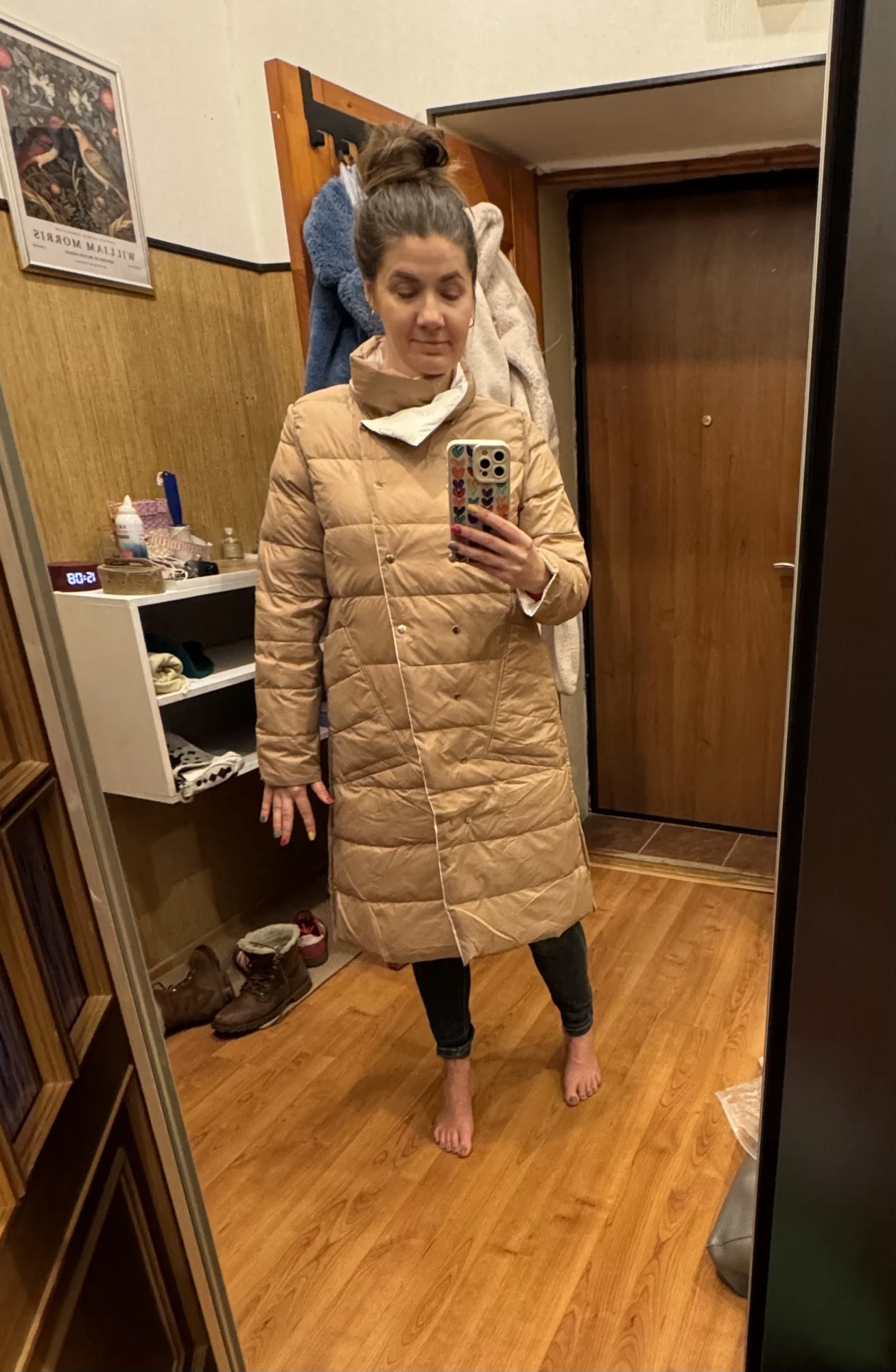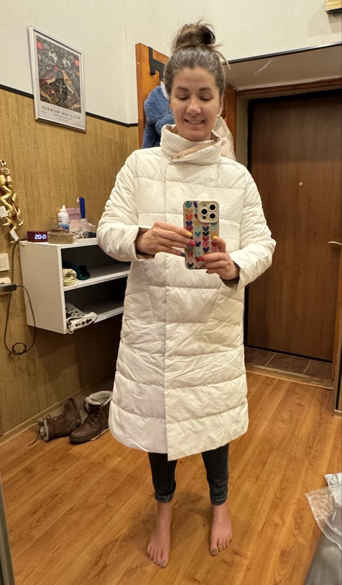 • Design: Long, double-breasted design with a turtleneck collar, providing full coverage and a flattering silhouette.