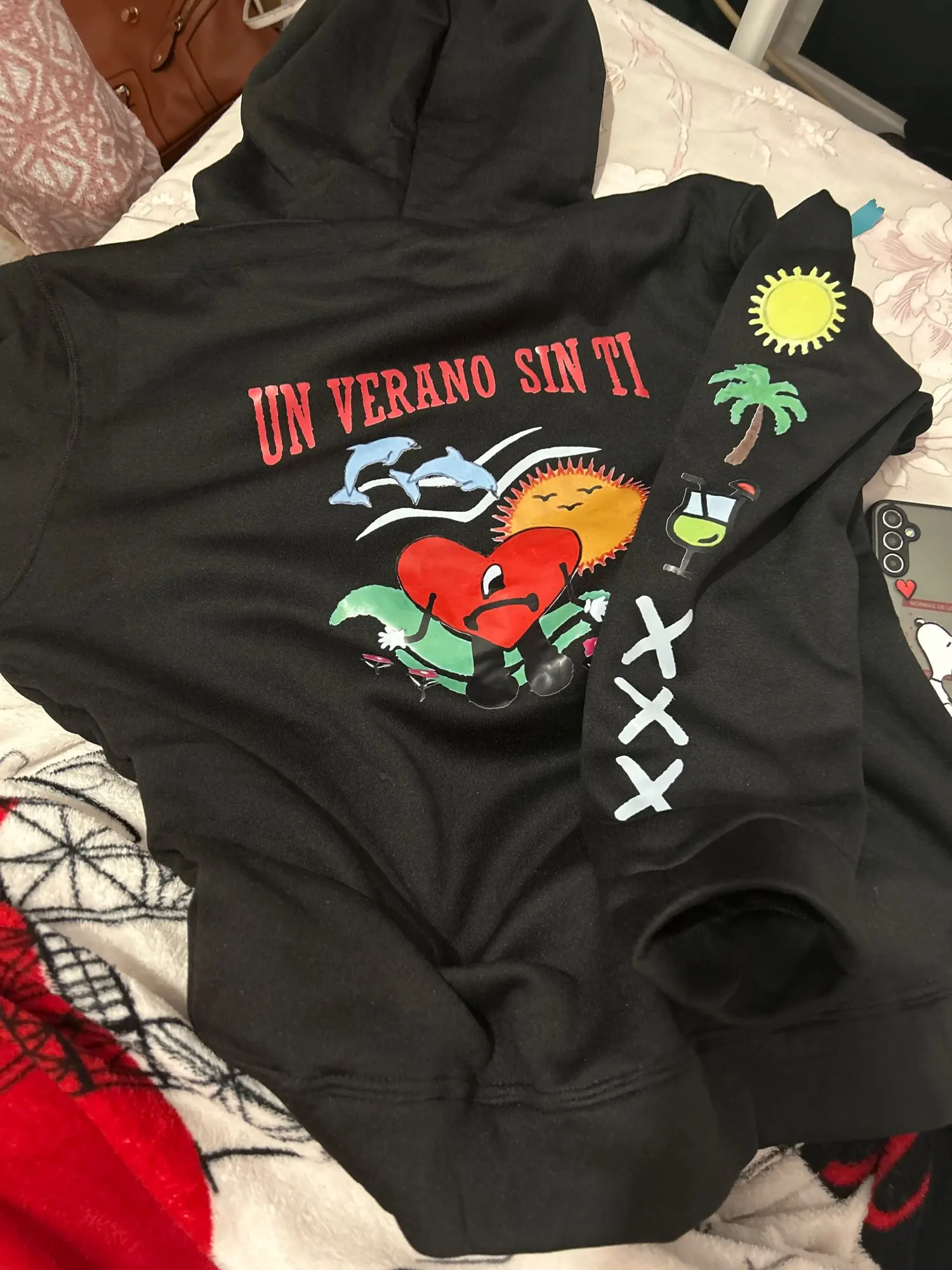 Crafted with the finest materials and featuring a fun and trendy graphic print, the Funny Bad Bunny Hoodie "Un Verano Sin Ti" offers a relaxed, comfortable fit that’s ideal for any occasion. With vibrant colors and a design that captures the essence of the artist’s music, this hoodie is the ultimate statement piece. Whether you're searching for cheap hoodies, in need of sweatshirts for women, or browsing mens sweatshirts sale, this black hoodie will elevate your wardrobe with ease.